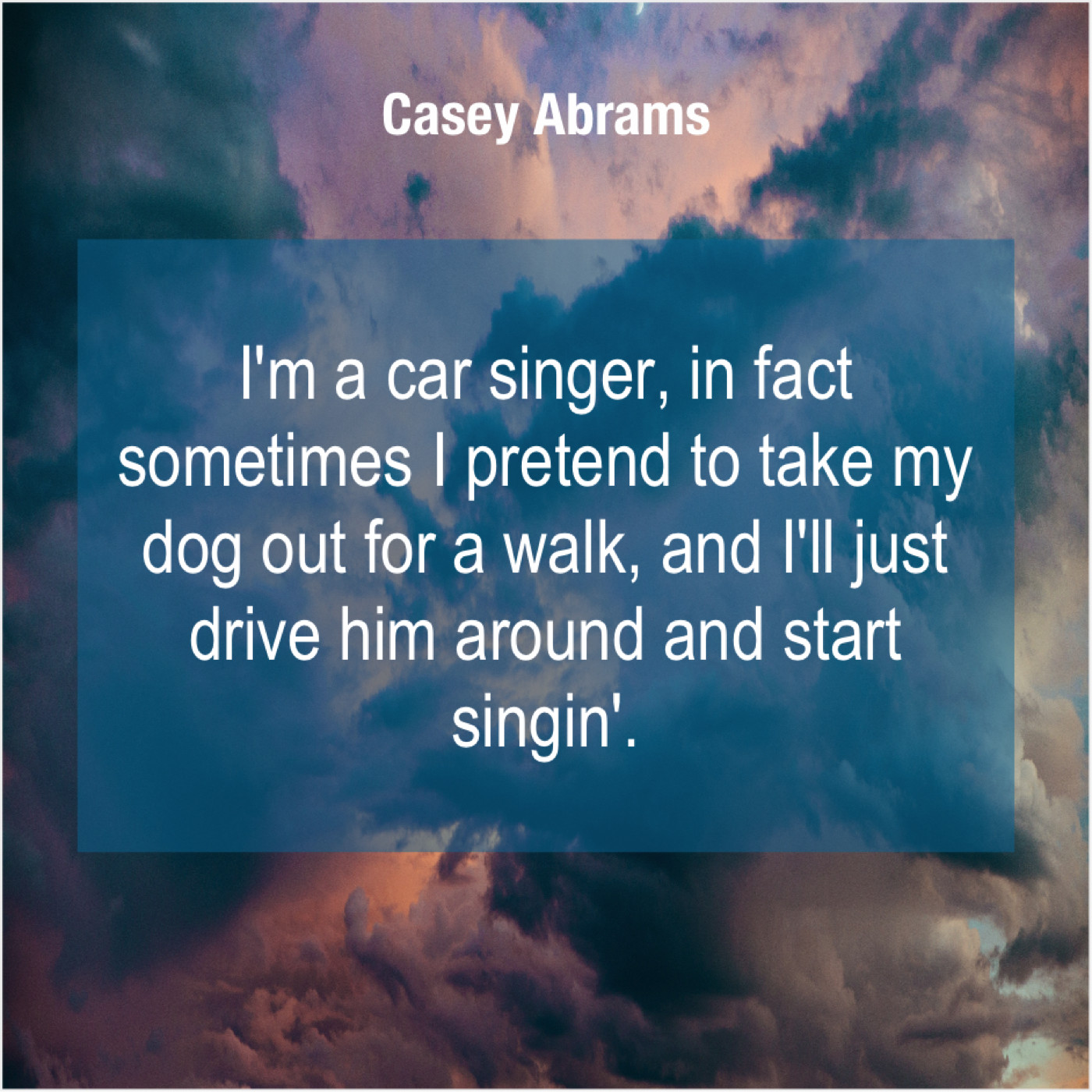 Casey Abrams Casey Abrams – I’m a car singer, in… May 24, 2019 admin “I’m a car singer, in fact sometimes I pretend to take my dog out for a walk, and I’ll just drive him around and start singin’.”-Casey Abrams
