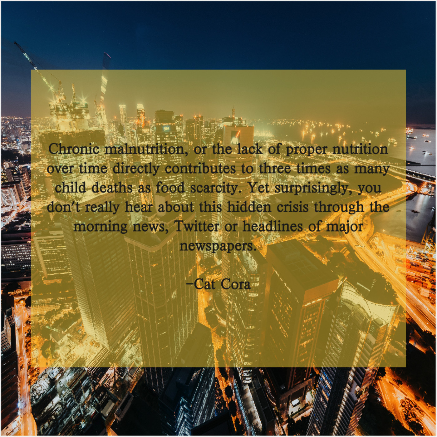“Chronic malnutrition, or the lack of proper nutrition over time directly contributes to three times as many child deaths as food scarcity. Yet surprisingly, you don’t really hear about this hidden crisis through the morning news, Twitter or headlines of major newspapers.”