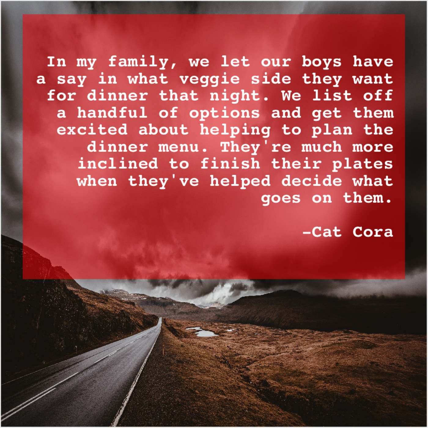 “In my family, we let our boys have a say in what veggie side they want for dinner that night. We list off a handful of options and get them excited about helping to plan the dinner menu. They’re much more inclined to finish their plates when they’ve helped decide what goes on them.”