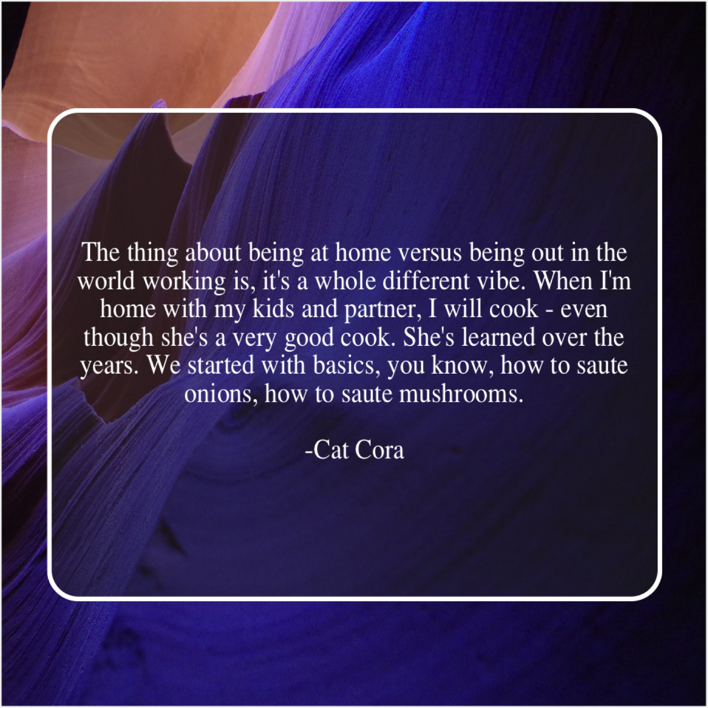 “The thing about being at home versus being out in the world working is, it’s a whole different vibe. When I’m home with my kids and partner, I will cook – even though she’s a very good cook. She’s learned over the years. We started with basics, you know, how to saute onions, how to saute mushrooms.”