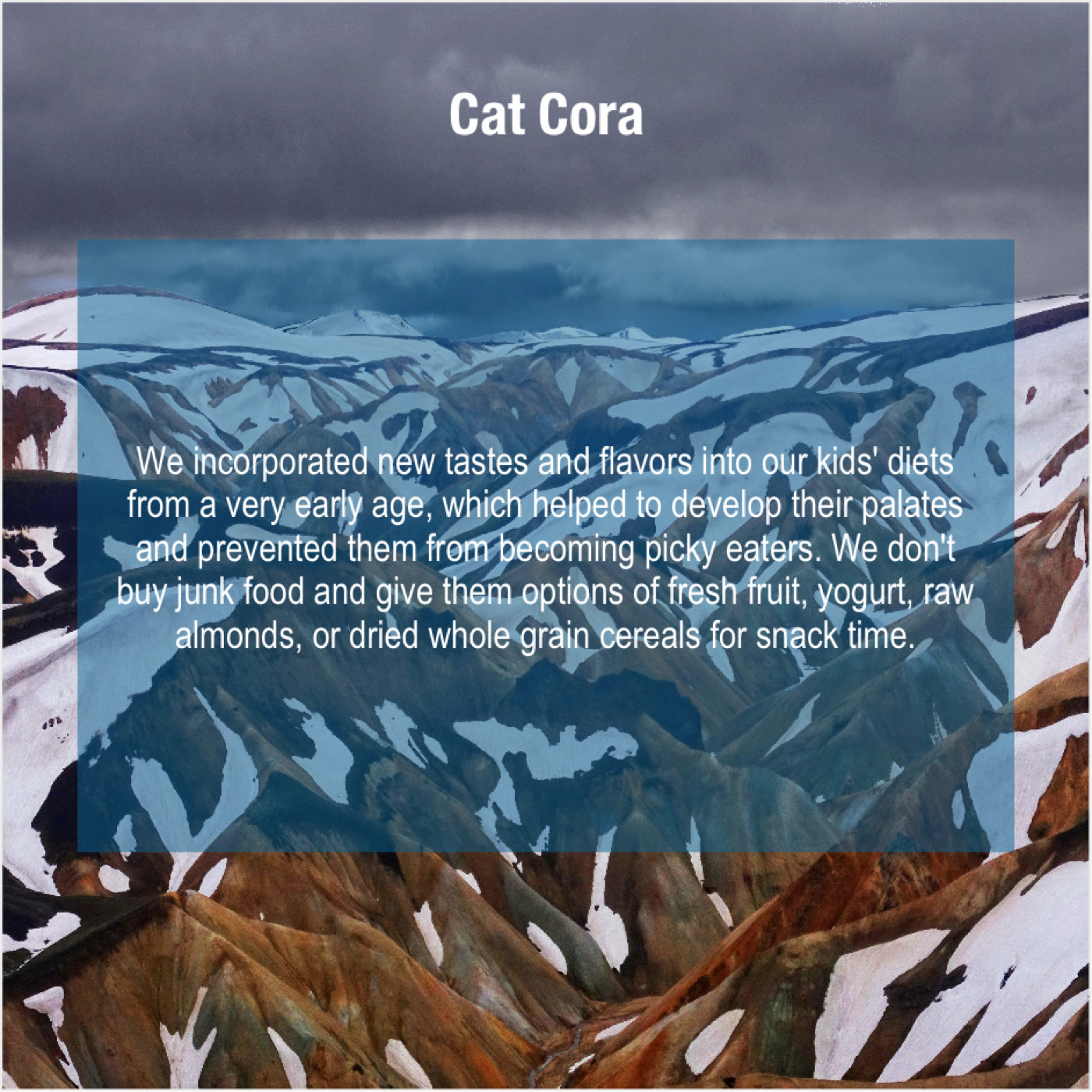 “We incorporated new tastes and flavors into our kids’ diets from a very early age, which helped to develop their palates and prevented them from becoming picky eaters. We don’t buy junk food and give them options of fresh fruit, yogurt, raw almonds, or dried whole grain cereals for snack time.”