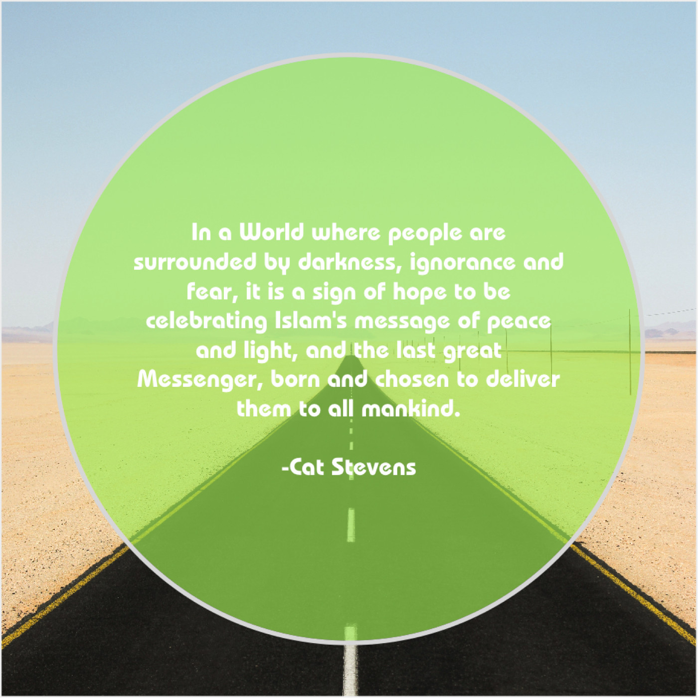 Cat Stevens Cat Stevens – In a World where people… March 5, 2019 admin “In a World where people are surrounded by darkness, ignorance and fear, it is a sign of hope to be celebrating Islam’s message of peace and light, and the last great Messenger, born and chosen to deliver them to all mankind.”-Cat Stevens