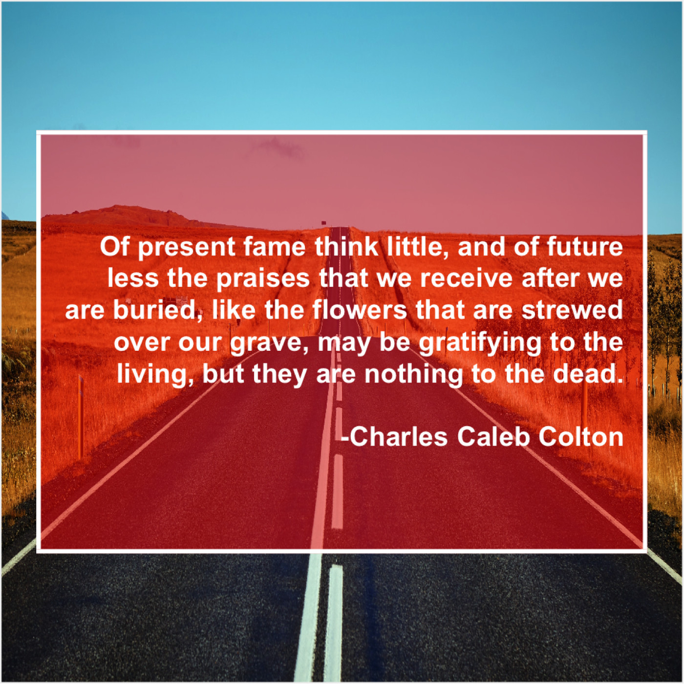 Charles Caleb Colton Charles Caleb Colton – Of present fame think little… May 15, 2019 admin “Of present fame think little, and of future less the praises that we receive after we are buried, like the flowers that are strewed over our grave, may be gratifying to the living, but they are nothing to the dead.”-Charles Caleb Colton