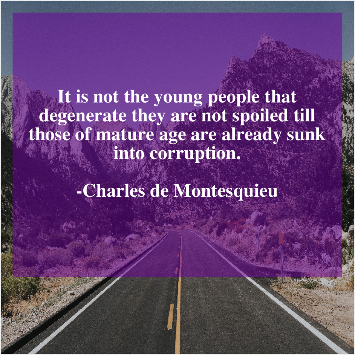 Charles de Montesquieu Charles de Montesquieu – It is not the young… June 7, 2019 admin “It is not the young people that degenerate they are not spoiled till those of mature age are already sunk into corruption.”-Charles de Montesquieu