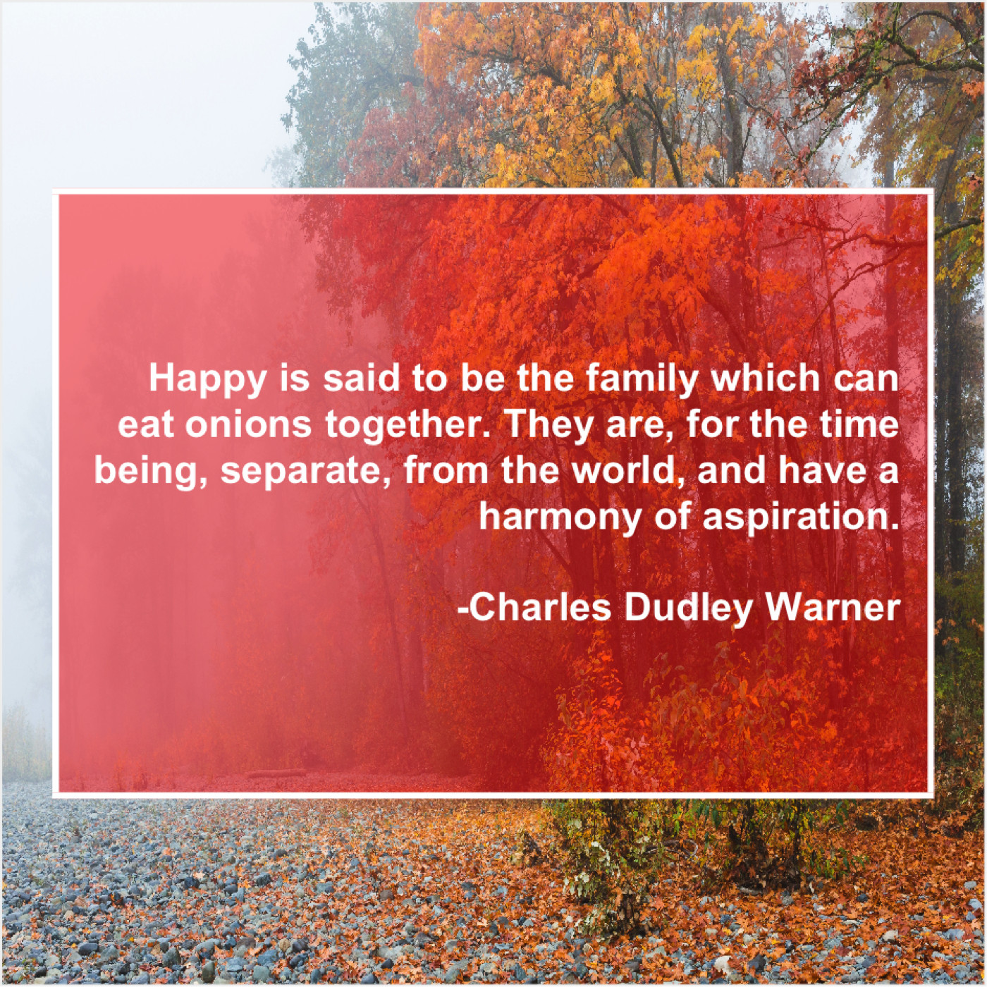 Charles Dudley Warner Charles Dudley Warner – Happy is said to be… June 2, 2019 admin “Happy is said to be the family which can eat onions together. They are, for the time being, separate, from the world, and have a harmony of aspiration.”-Charles Dudley Warner