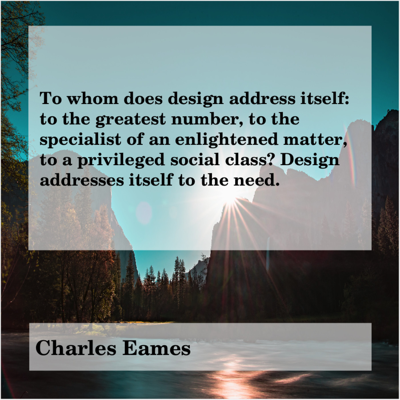 Charles Eames Charles Eames – To whom does design address… August 12, 2019 admin “To whom does design address itself: to the greatest number, to the specialist of an enlightened matter, to a privileged social class? Design addresses itself to the need.”-Charles Eames