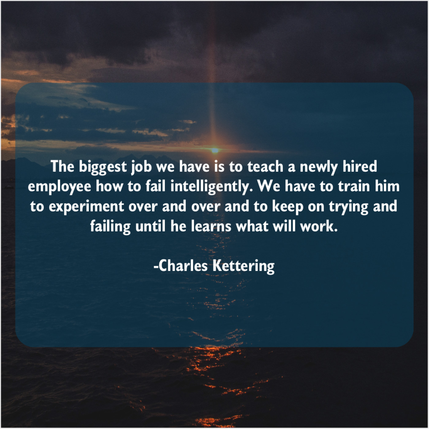 Charles Kettering Charles Kettering – The biggest job we have… January 15, 2019 admin “The biggest job we have is to teach a newly hired employee how to fail intelligently. We have to train him to experiment over and over and to keep on trying and failing until he learns what will work.”-Charles Kettering