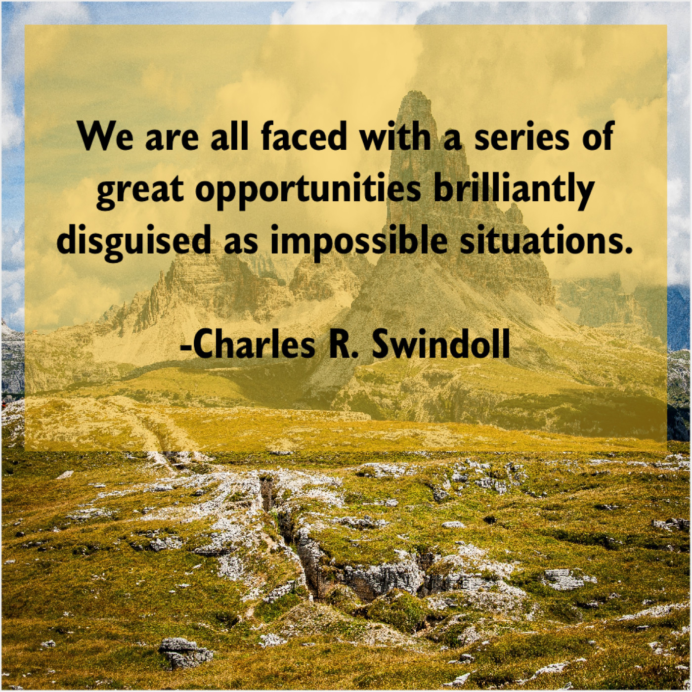 Charles R. Swindoll Charles R. Swindoll – We are all faced with… November 17, 2018 admin “We are all faced with a series of great opportunities brilliantly disguised as impossible situations.”-Charles R. Swindoll