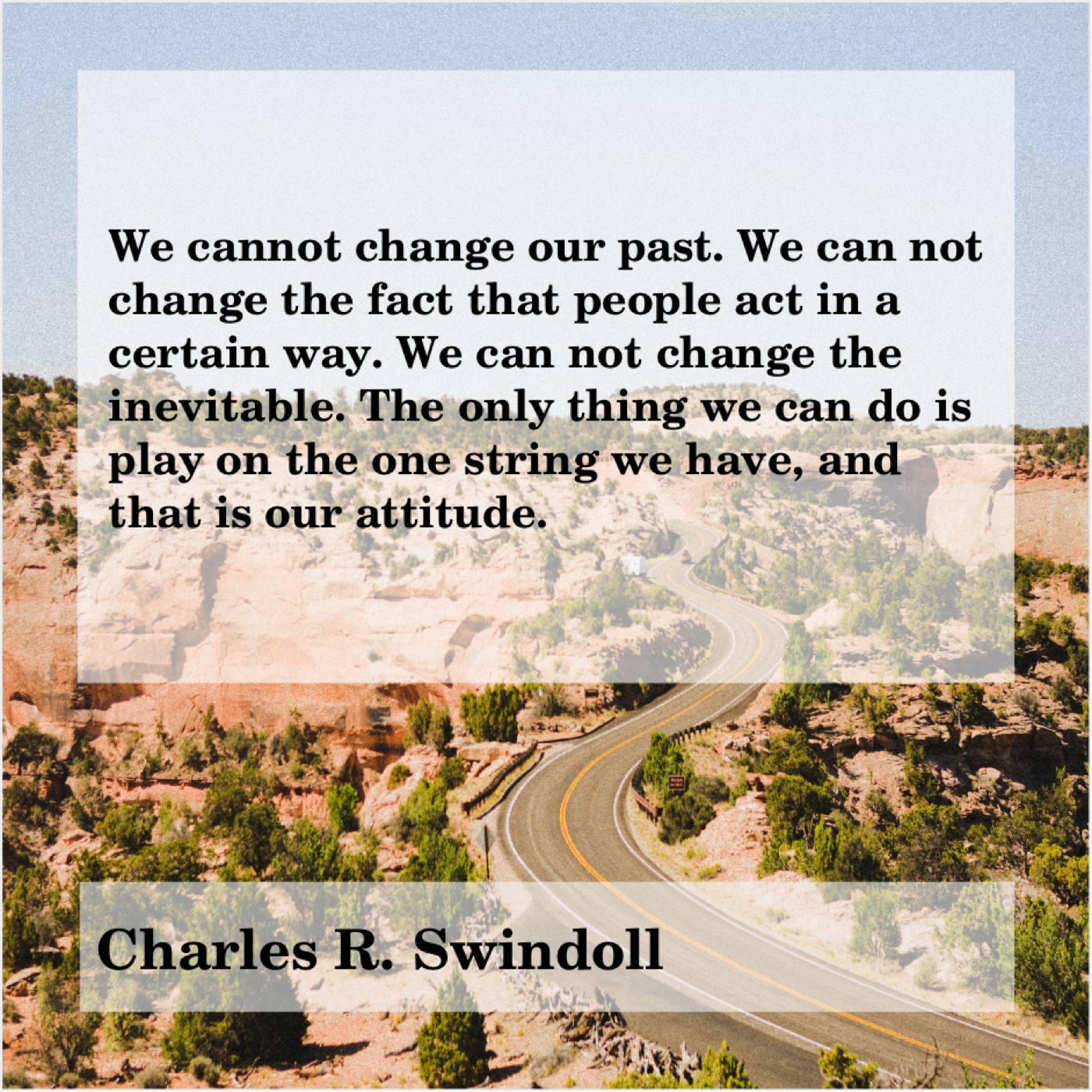Charles R. Swindoll Charles R. Swindoll – We cannot change our past… August 30, 2019 admin “We cannot change our past. We can not change the fact that people act in a certain way. We can not change the inevitable. The only thing we can do is play on the one string we have, and that is our attitude.”-Charles R. Swindoll