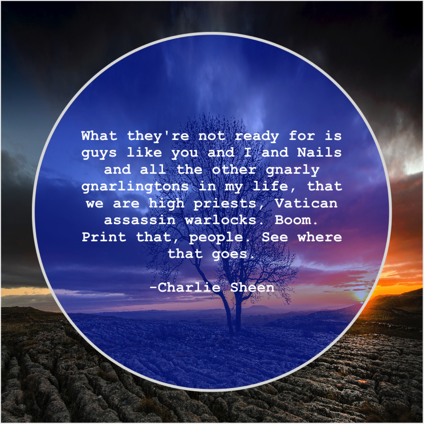 Charlie Sheen Charlie Sheen – What they’re not ready for… January 28, 2019 admin “What they’re not ready for is guys like you and I and Nails and all the other gnarly gnarlingtons in my life, that we are high priests, Vatican assassin warlocks. Boom. Print that, people. See where that goes.”-Charlie Sheen