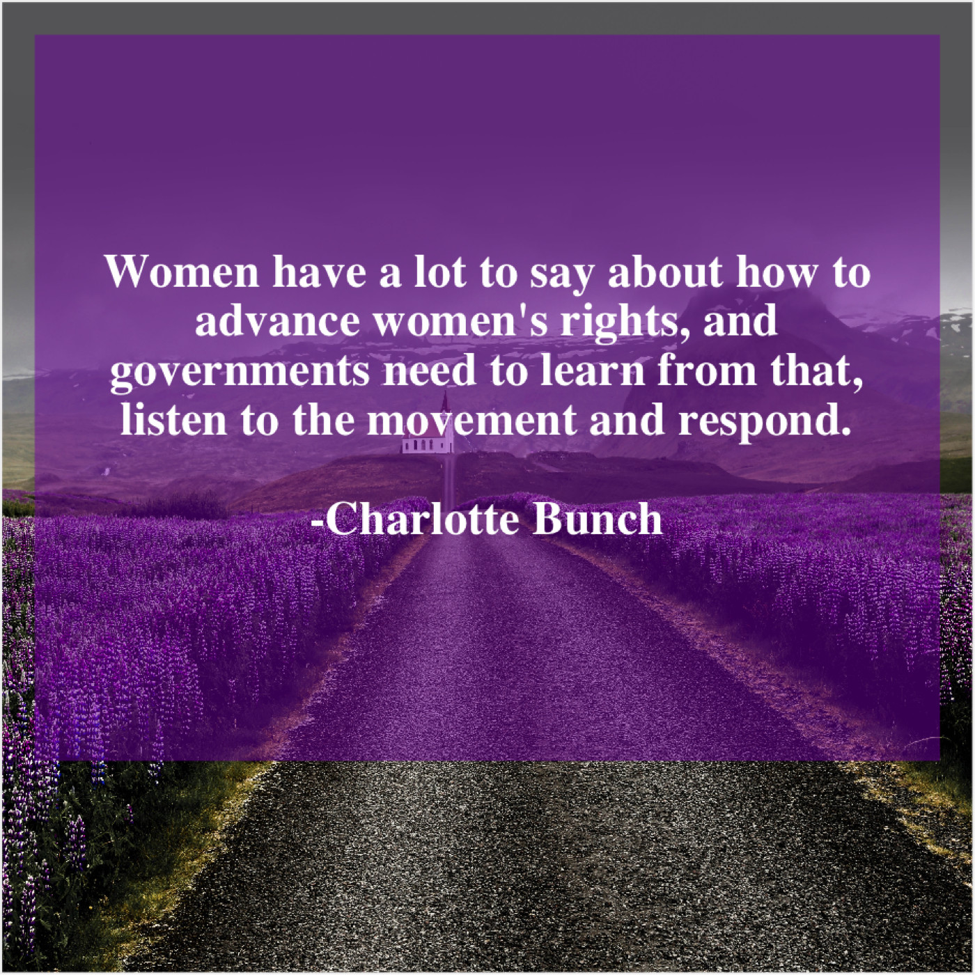 Charlotte Bunch Charlotte Bunch – Women have a lot to… June 3, 2019 admin “Women have a lot to say about how to advance women’s rights, and governments need to learn from that, listen to the movement and respond.”-Charlotte Bunch