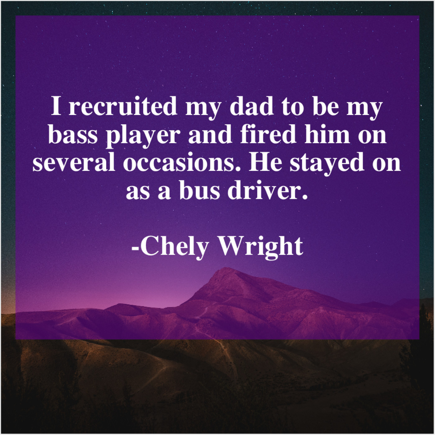 Chely Wright Chely Wright – I recruited my dad to… December 21, 2018 admin “I recruited my dad to be my bass player and fired him on several occasions. He stayed on as a bus driver.”-Chely Wright