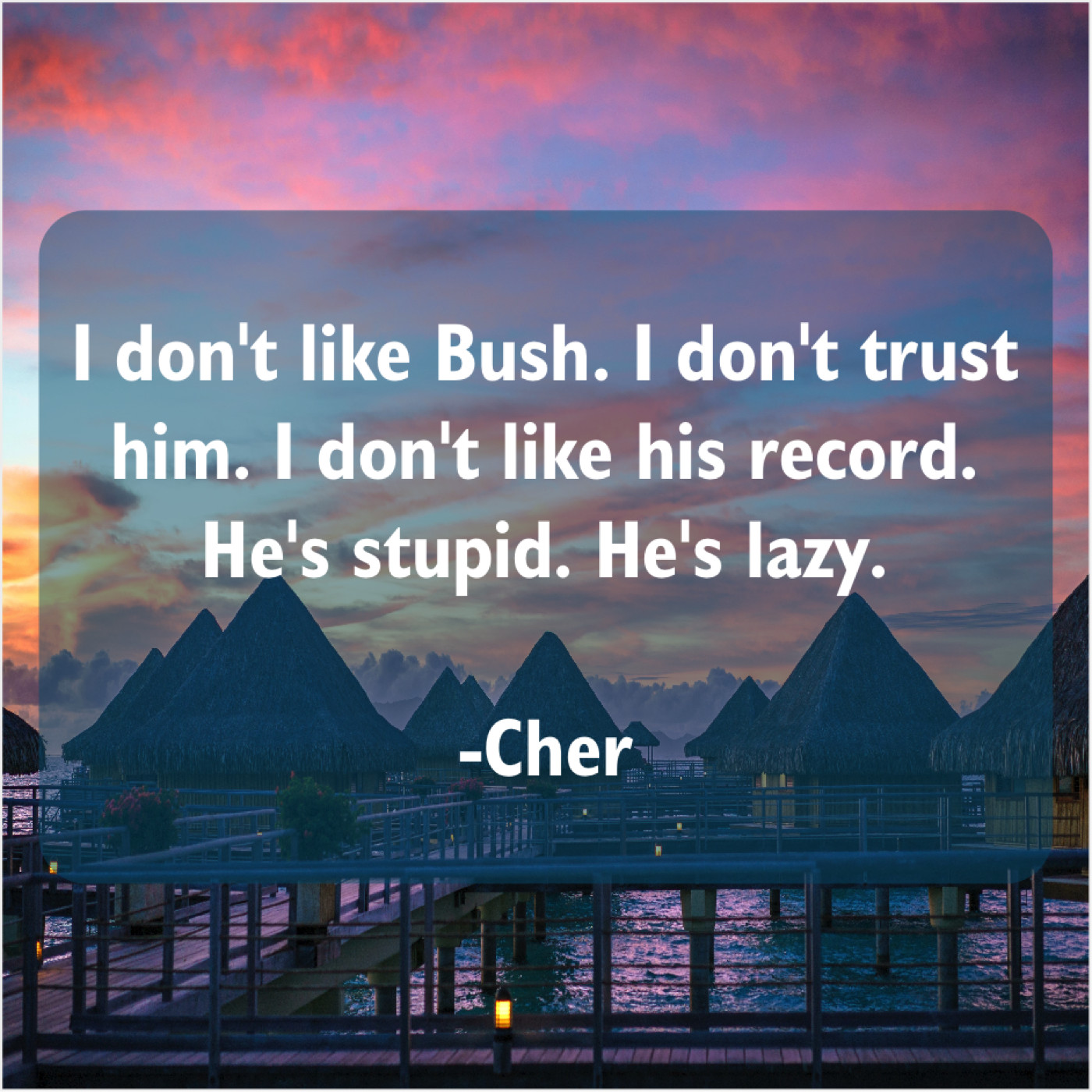 Cher Cher – I don’t like Bush. I… July 21, 2019 admin “I don’t like Bush. I don’t trust him. I don’t like his record. He’s stupid. He’s lazy.”-Cher