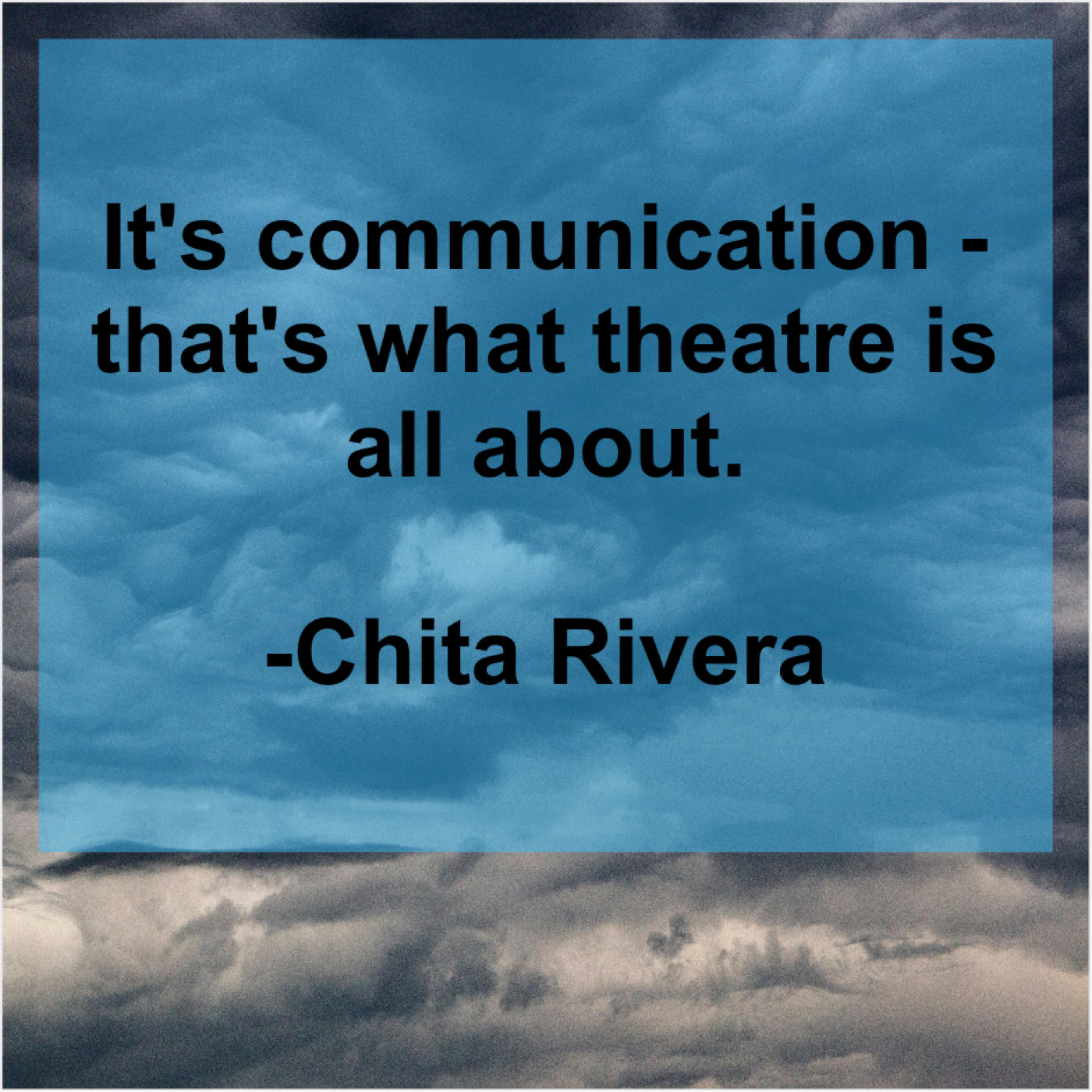 Chita Rivera Chita Rivera – It’s communication – that’s what theatre… May 10, 2019 admin “It’s communication – that’s what theatre is all about.”-Chita Rivera