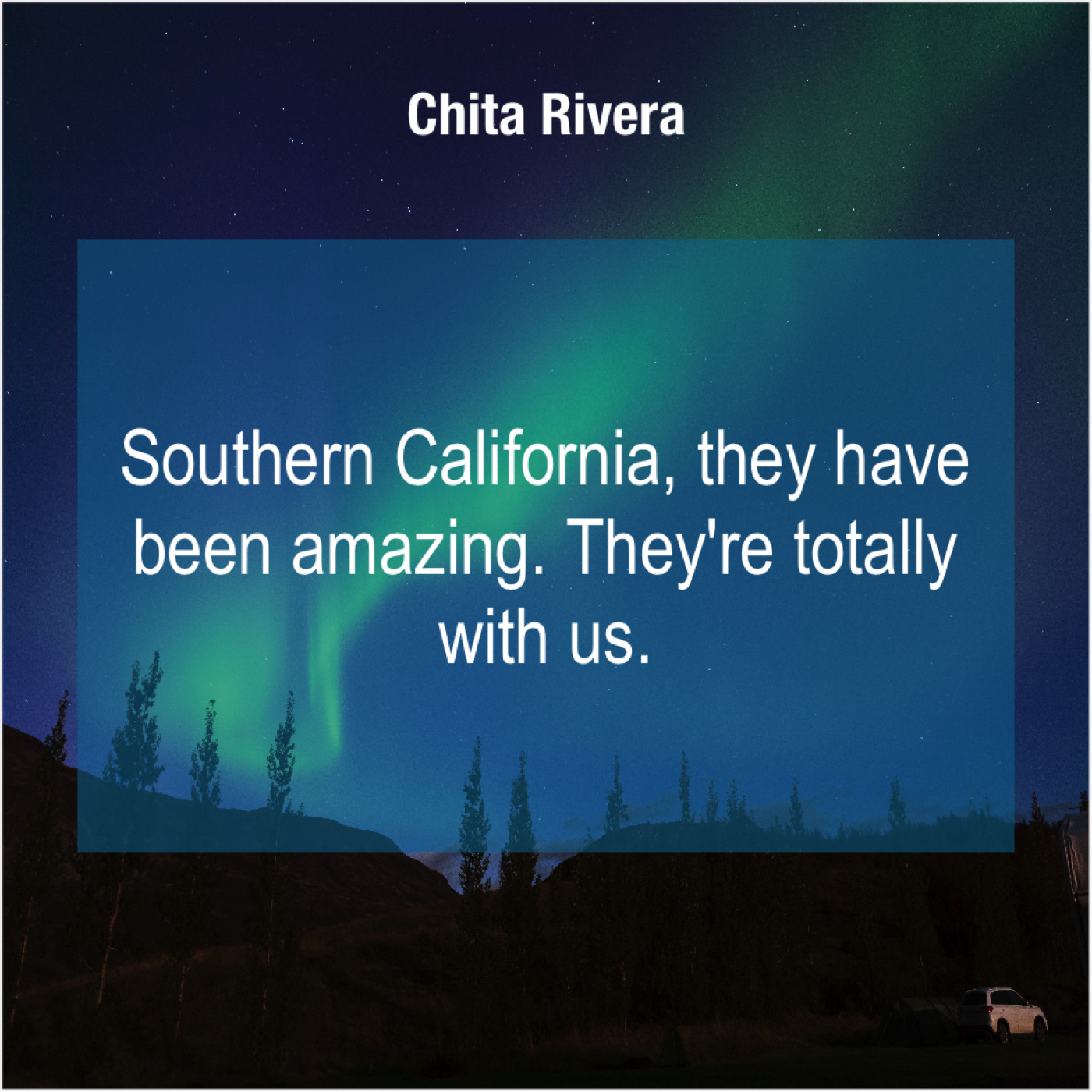 Chita Rivera Chita Rivera – Southern California, they have been… March 10, 2019 admin “Southern California, they have been amazing. They’re totally with us.”-Chita Rivera