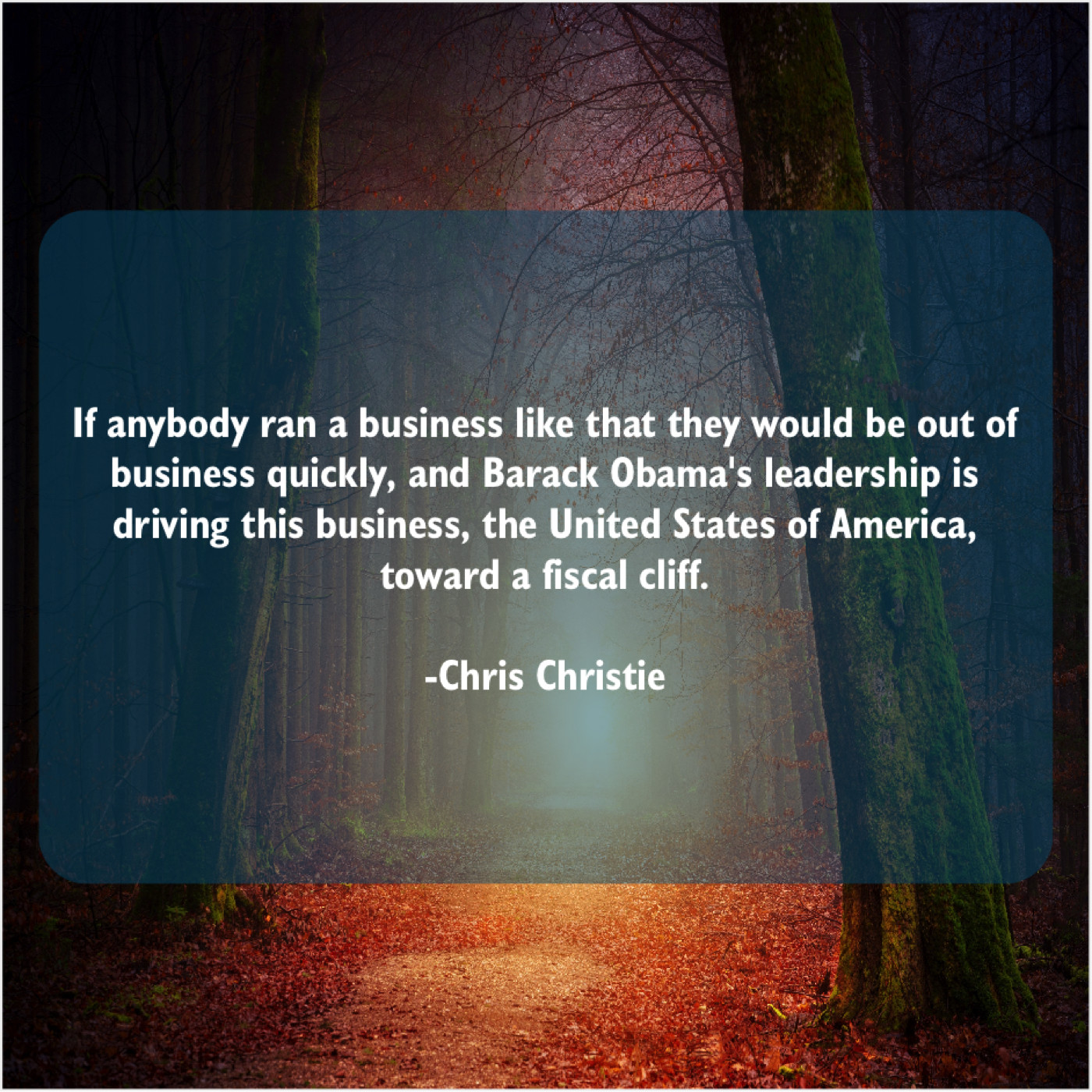 Chris Christie Chris Christie – If anybody ran a business… September 19, 2019 admin “If anybody ran a business like that they would be out of business quickly, and Barack Obama’s leadership is driving this business, the United States of America, toward a fiscal cliff.”-Chris Christie