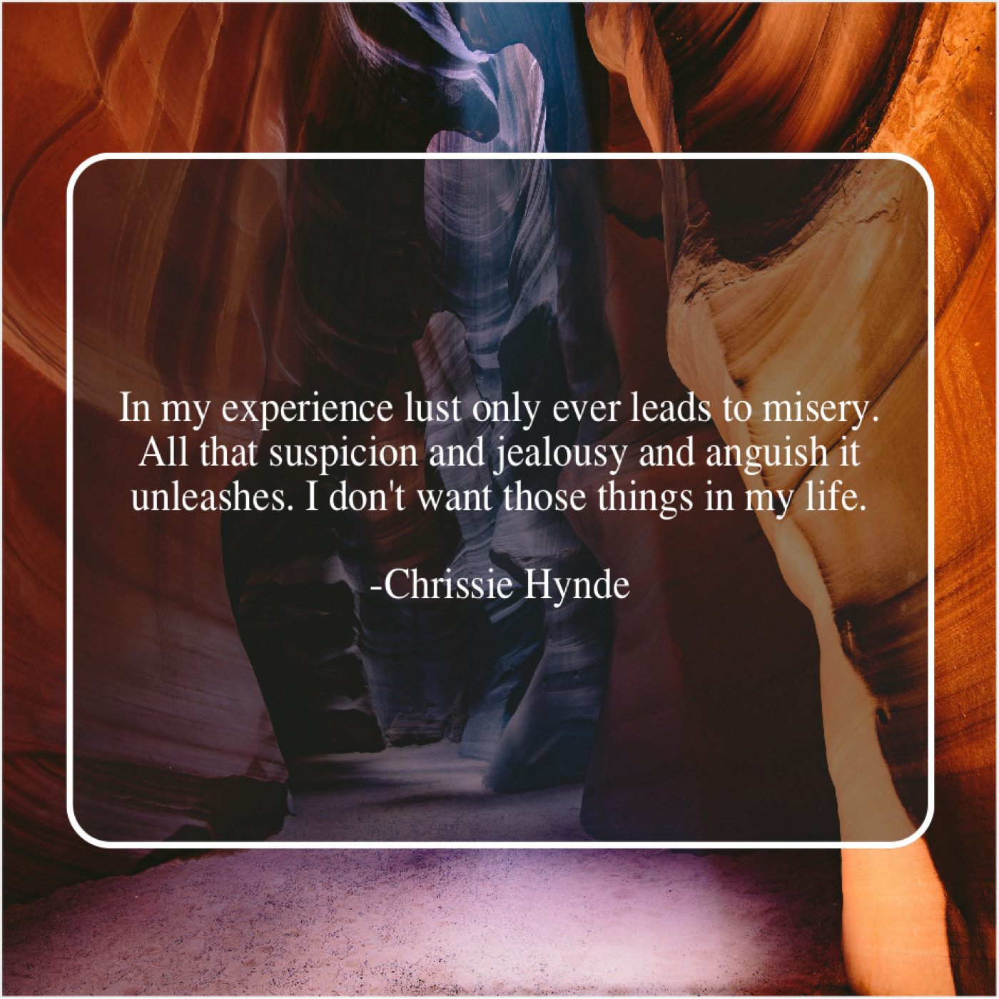 Chrissie Hynde Chrissie Hynde – In my experience lust only… November 28, 2018 admin “In my experience lust only ever leads to misery. All that suspicion and jealousy and anguish it unleashes. I don’t want those things in my life.”-Chrissie Hynde