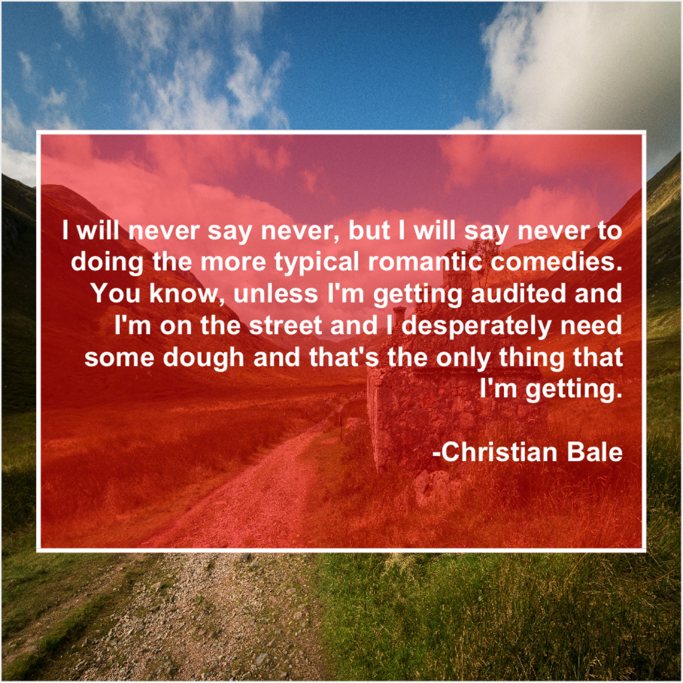 Christian Bale Christian Bale – I will never say never… August 15, 2019 admin “I will never say never, but I will say never to doing the more typical romantic comedies. You know, unless I’m getting audited and I’m on the street and I desperately need some dough and that’s the only thing that I’m getting.”-Christian Bale