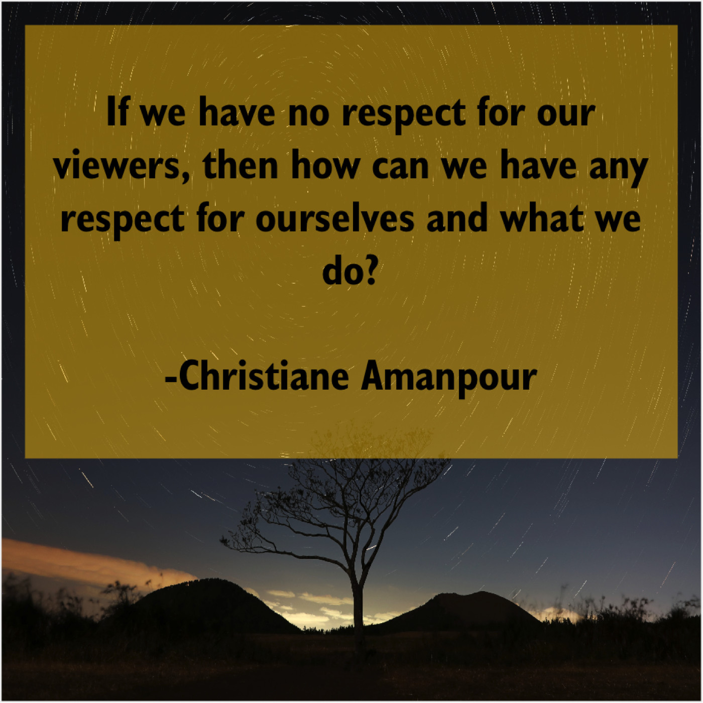 Christiane Amanpour Christiane Amanpour – If we have no respect… June 11, 2019 admin “If we have no respect for our viewers, then how can we have any respect for ourselves and what we do?”-Christiane Amanpour