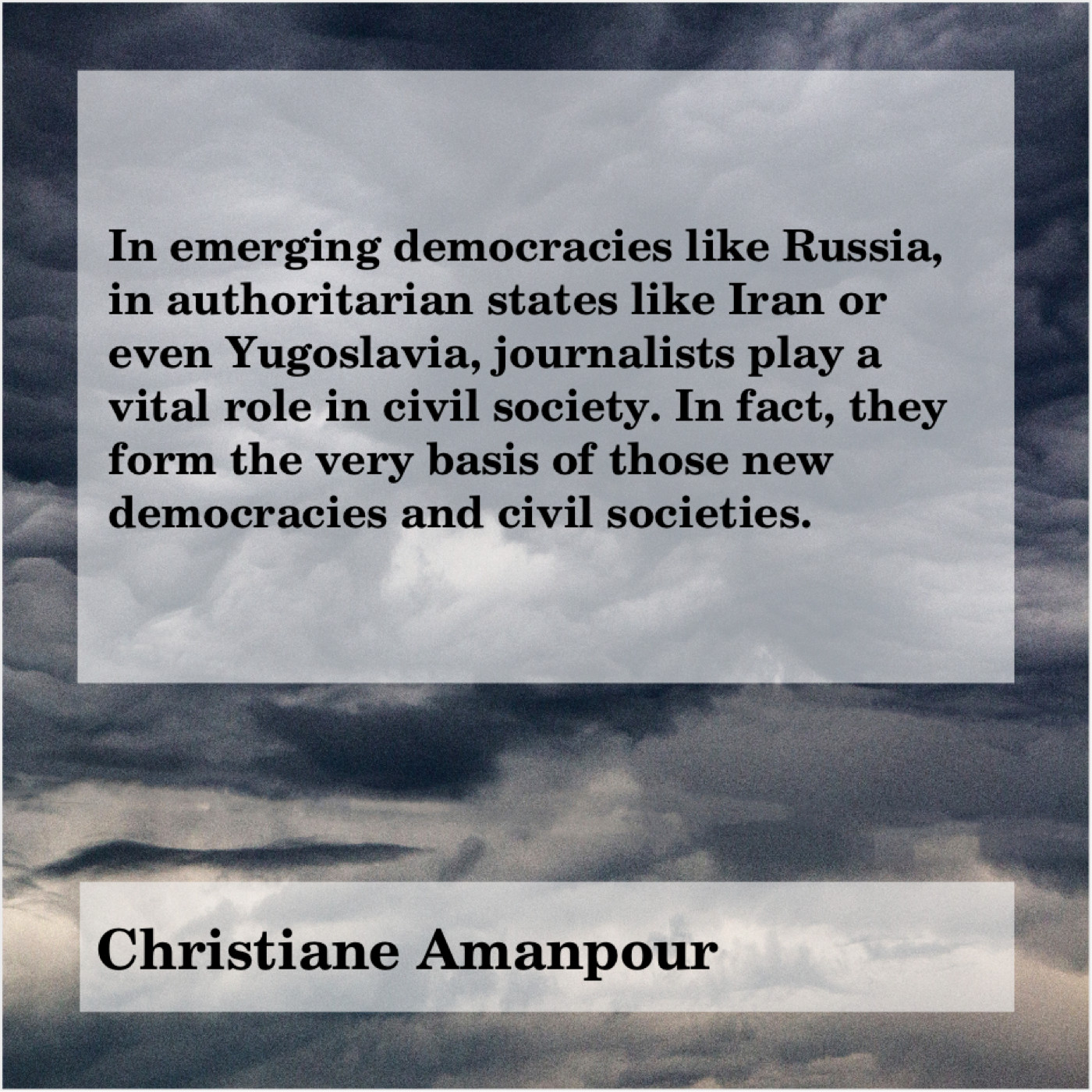 Christiane Amanpour Christiane Amanpour – In emerging democracies like Russia… February 24, 2019 admin “In emerging democracies like Russia, in authoritarian states like Iran or even Yugoslavia, journalists play a vital role in civil society. In fact, they form the very basis of those new democracies and civil societies.”-Christiane Amanpour