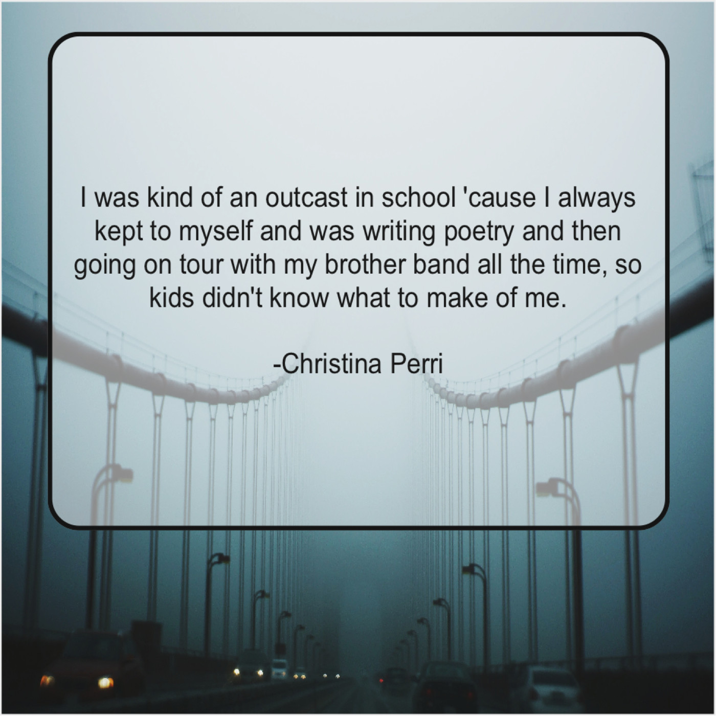 Christina Perri Christina Perri – I was kind of an… September 5, 2019 admin “I was kind of an outcast in school ’cause I always kept to myself and was writing poetry and then going on tour with my brother band all the time, so kids didn’t know what to make of me.”-Christina Perri