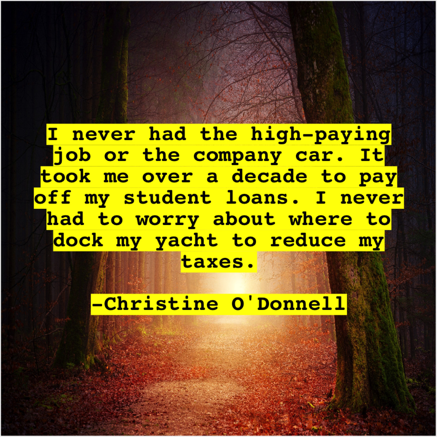 Christine O'Donnell Christine O’Donnell – I never had the high… January 9, 2019 admin “I never had the high-paying job or the company car. It took me over a decade to pay off my student loans. I never had to worry about where to dock my yacht to reduce my taxes.”-Christine O’Donnell