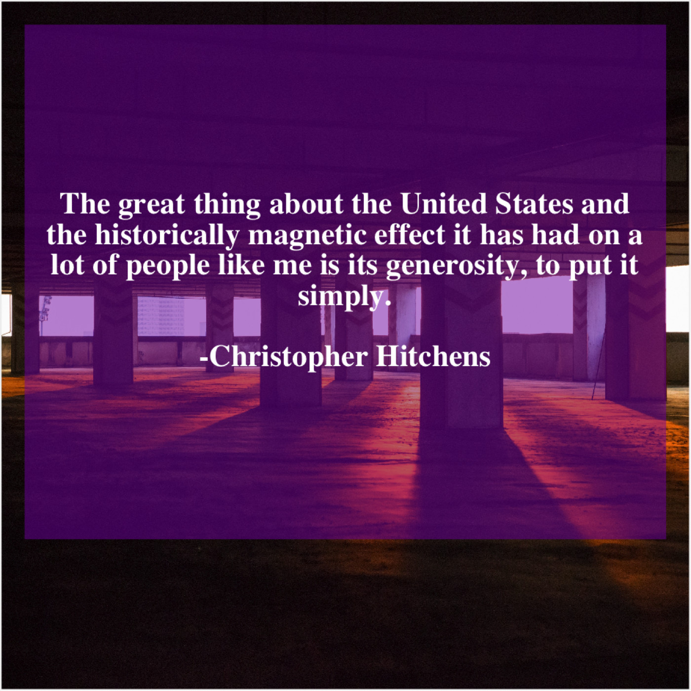 Christopher Hitchens Christopher Hitchens – The great thing about the… February 2, 2019 admin “The great thing about the United States and the historically magnetic effect it has had on a lot of people like me is its generosity, to put it simply.”-Christopher Hitchens