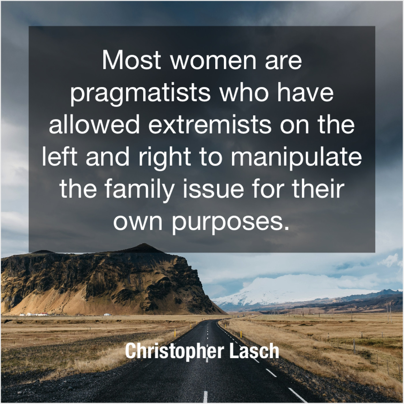 Christopher Lasch Christopher Lasch – Most women are pragmatists who… May 29, 2019 admin “Most women are pragmatists who have allowed extremists on the left and right to manipulate the family issue for their own purposes.”-Christopher Lasch