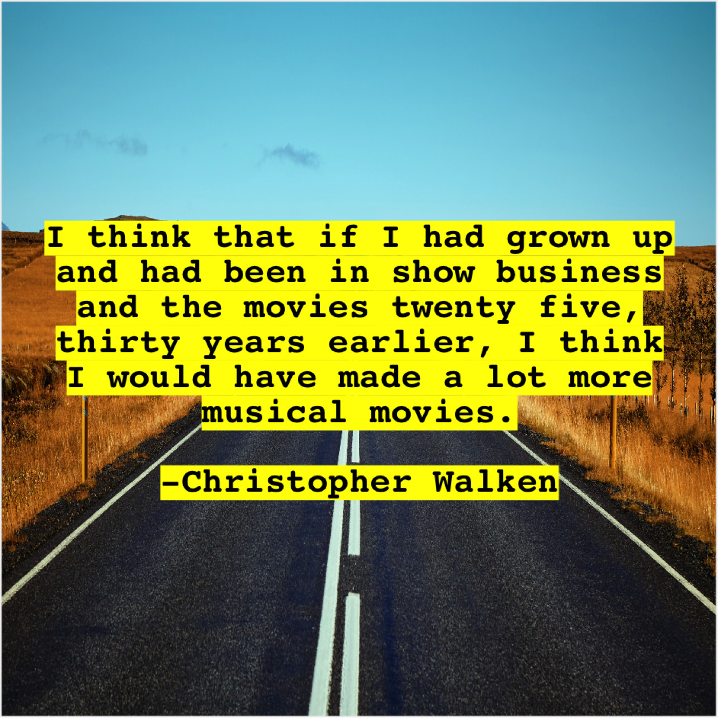 Christopher Walken Christopher Walken – I think that if I… February 8, 2019 admin “I think that if I had grown up and had been in show business and the movies twenty five, thirty years earlier, I think I would have made a lot more musical movies.”-Christopher Walken