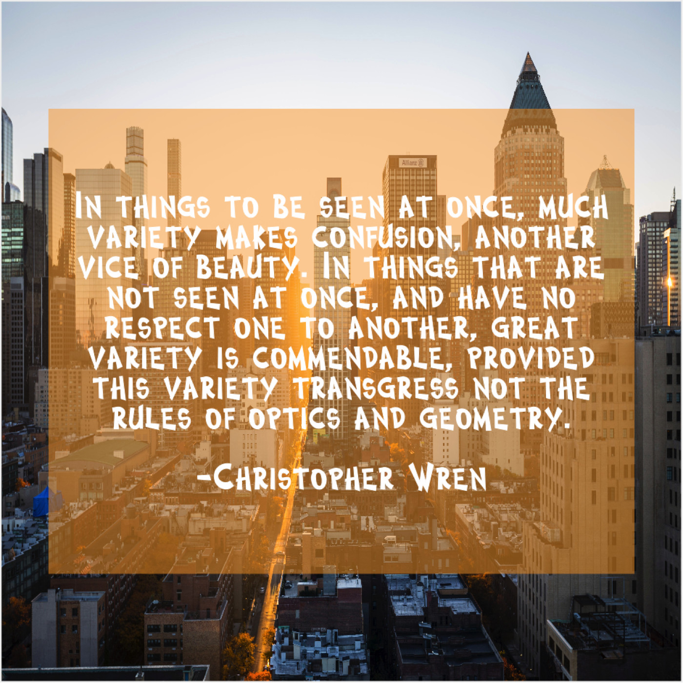 “In things to be seen at once, much variety makes confusion, another vice of beauty. In things that are not seen at once, and have no respect one to another, great variety is commendable, provided this variety transgress not the rules of optics and geometry.”