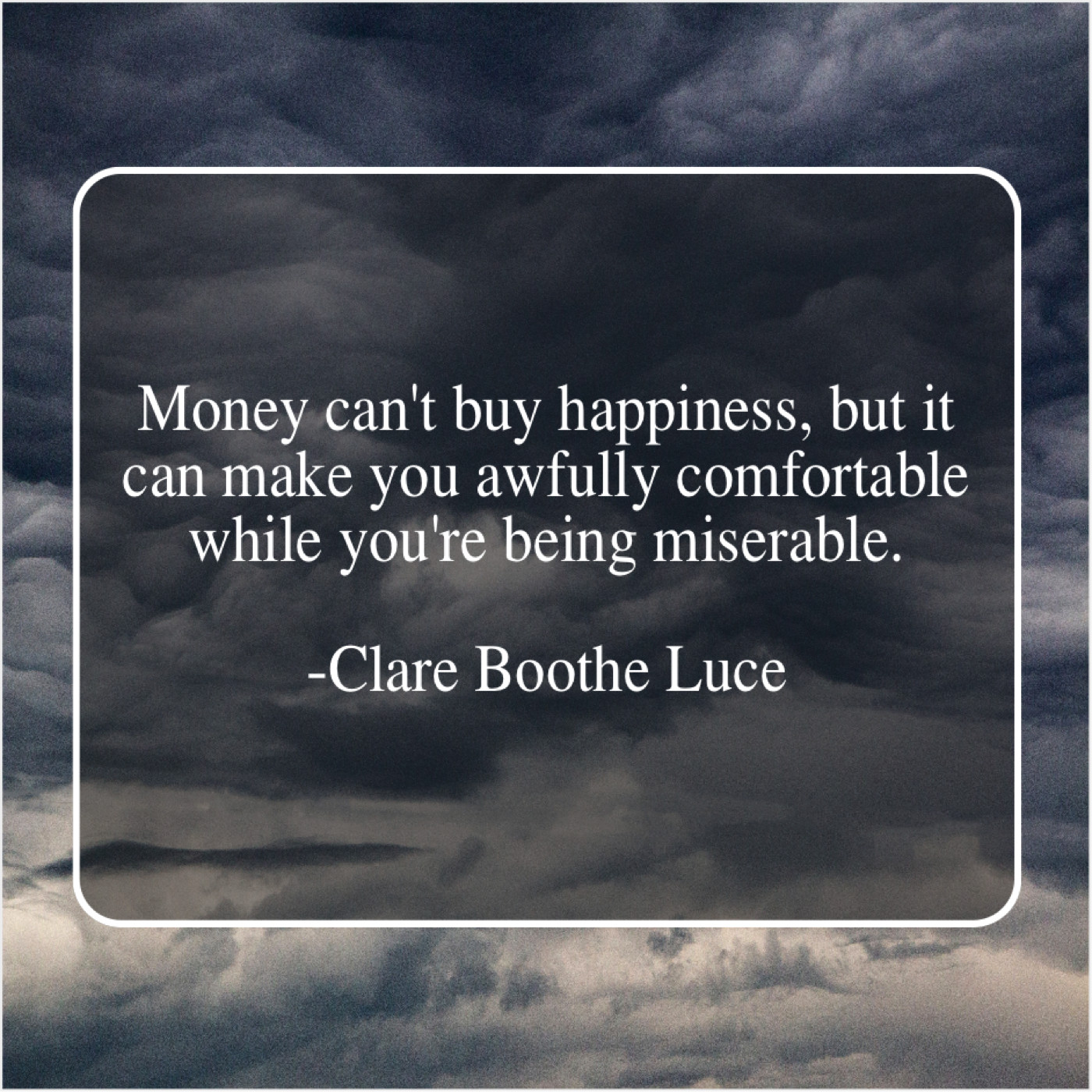Clare Boothe Luce Clare Boothe Luce – Money can’t buy happiness, but… May 2, 2019 admin “Money can’t buy happiness, but it can make you awfully comfortable while you’re being miserable.”-Clare Boothe Luce
