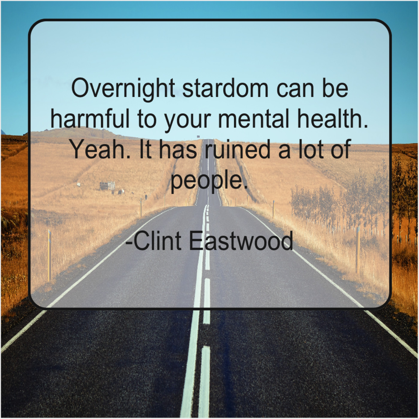 Clint Eastwood Clint Eastwood – Overnight stardom can be harmful… January 4, 2019 admin “Overnight stardom can be harmful to your mental health. Yeah. It has ruined a lot of people.”-Clint Eastwood