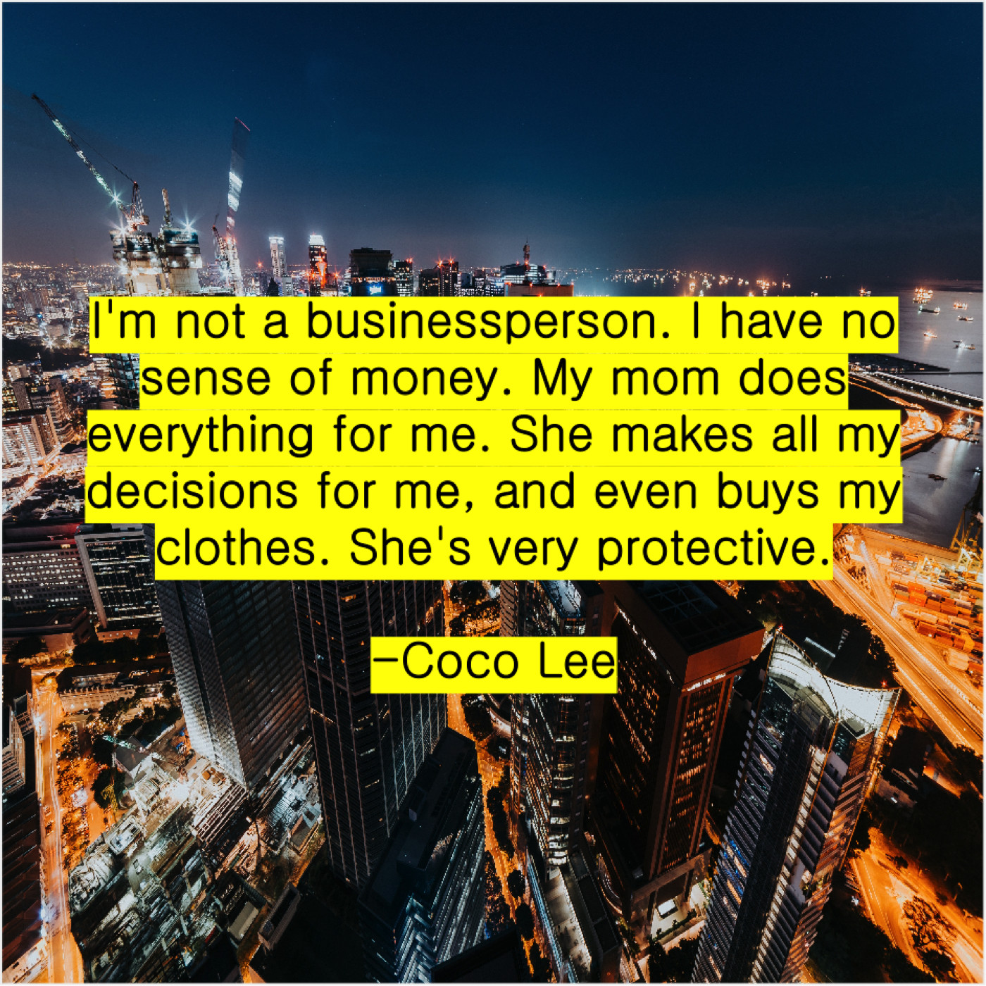 Coco Lee Coco Lee – I’m not a businessperson. I… January 30, 2019 admin “I’m not a businessperson. I have no sense of money. My mom does everything for me. She makes all my decisions for me, and even buys my clothes. She’s very protective.”-Coco Lee
