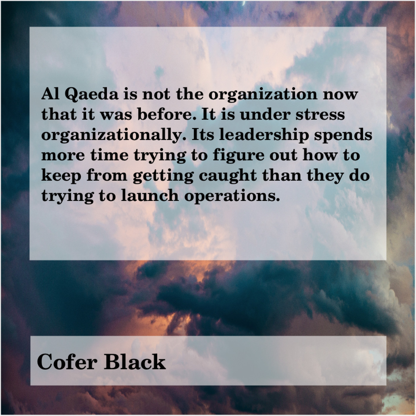 Cofer Black Cofer Black – Al Qaeda is not the… March 24, 2019 admin “Al Qaeda is not the organization now that it was before. It is under stress organizationally. Its leadership spends more time trying to figure out how to keep from getting caught than they do trying to launch operations.”-Cofer Black