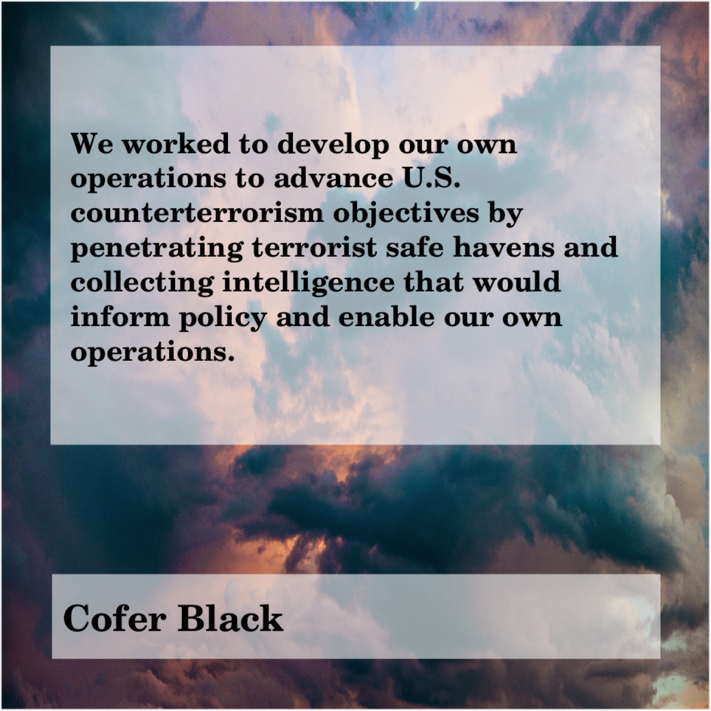 Cofer Black Cofer Black – We worked to develop our… April 19, 2019 admin “We worked to develop our own operations to advance U.S. counterterrorism objectives by penetrating terrorist safe havens and collecting intelligence that would inform policy and enable our own operations.”-Cofer Black