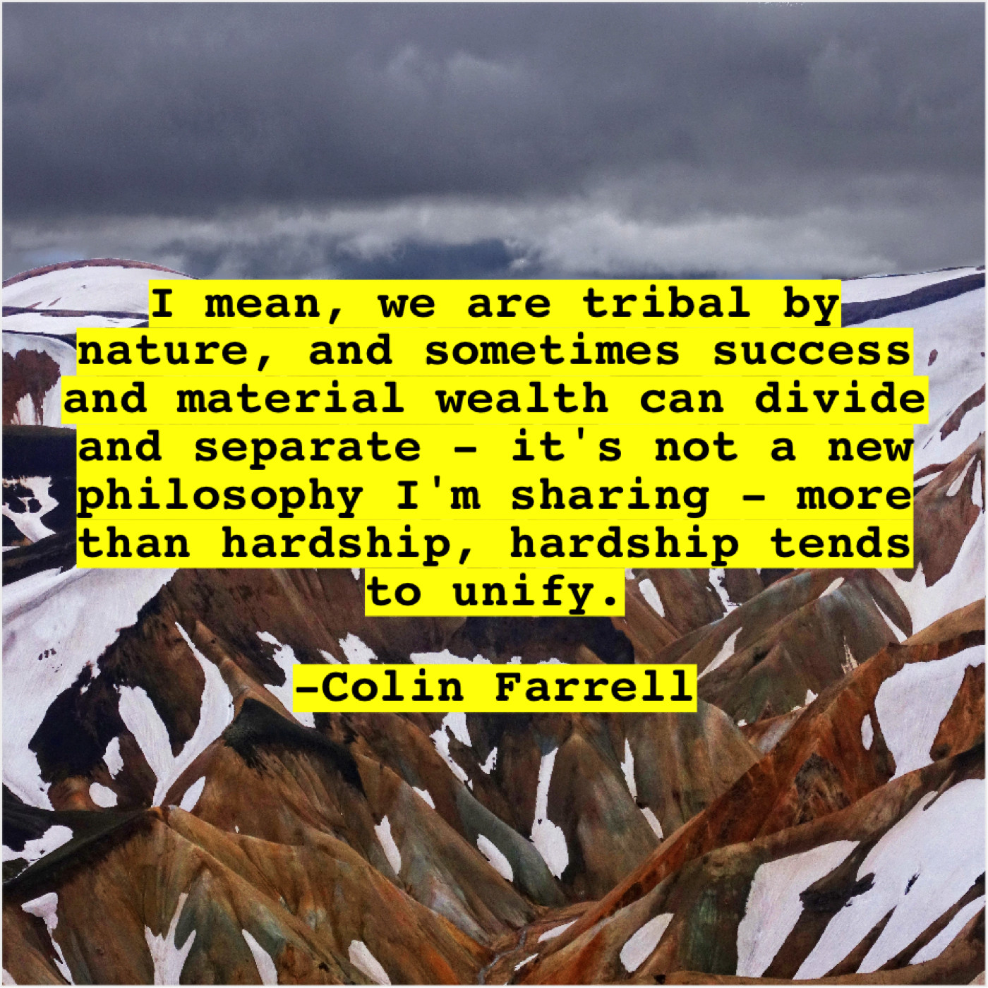 Colin Farrell Colin Farrell – I mean, we are tribal… April 20, 2019 admin “I mean, we are tribal by nature, and sometimes success and material wealth can divide and separate – it’s not a new philosophy I’m sharing – more than hardship, hardship tends to unify.”-Colin Farrell