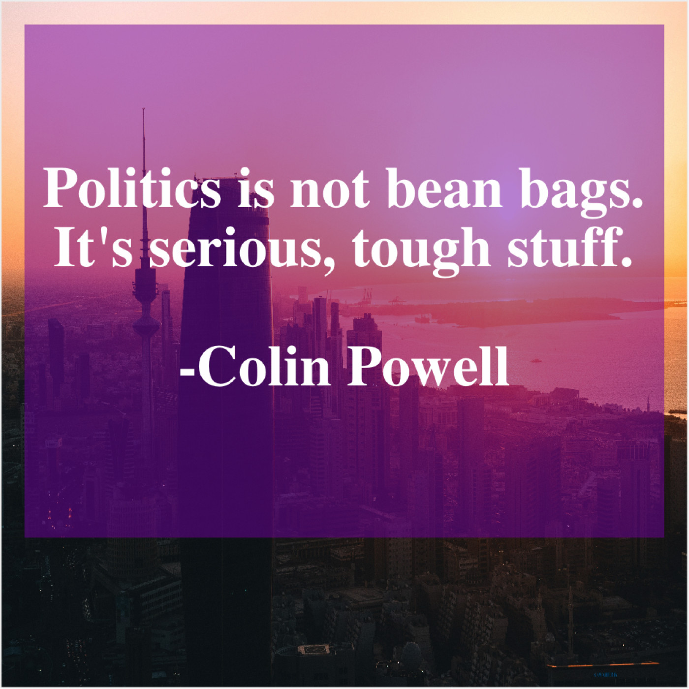 Colin Powell Colin Powell – Politics is not bean bags… December 19, 2018 admin “Politics is not bean bags. It’s serious, tough stuff.”-Colin Powell