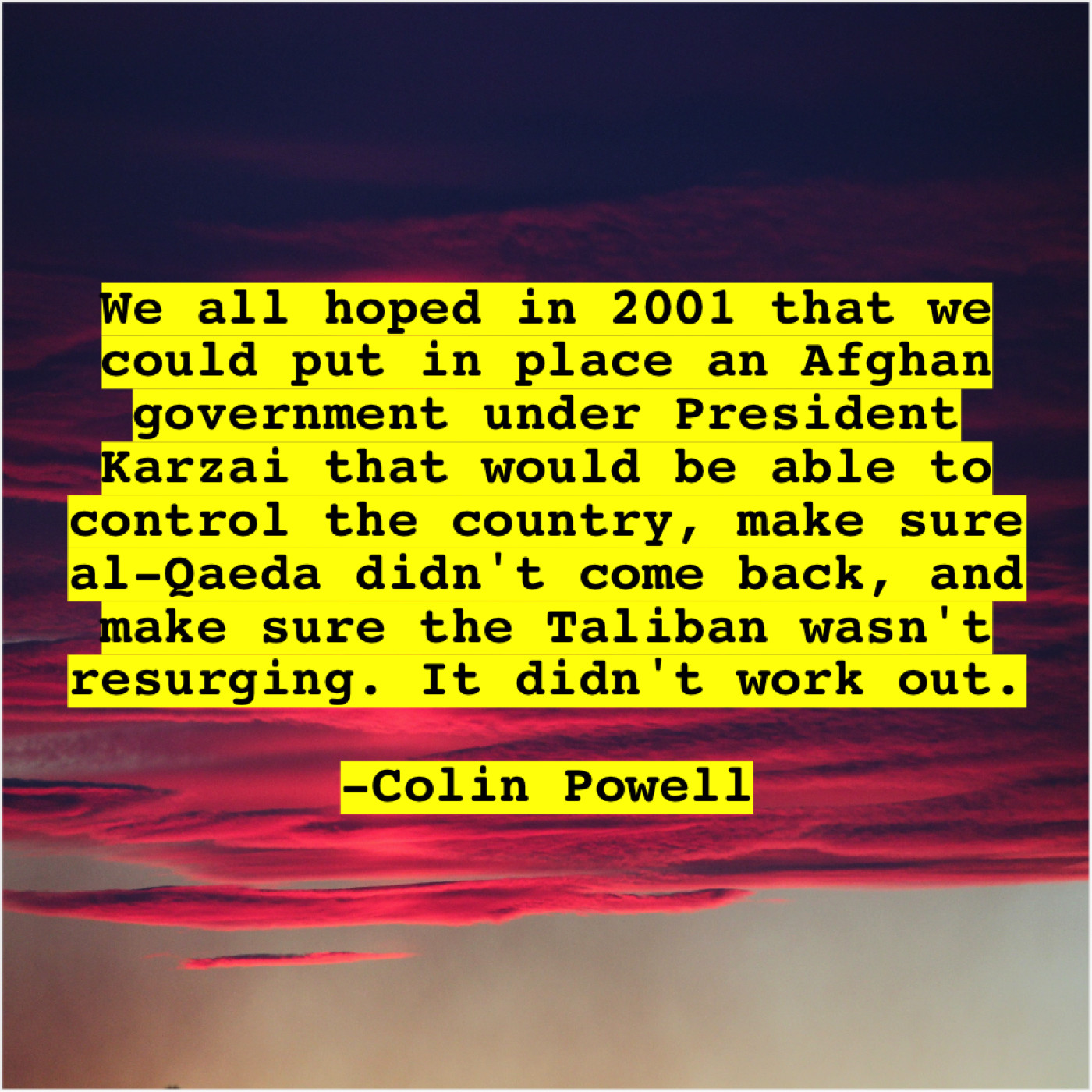 “We all hoped in 2001 that we could put in place an Afghan government under President Karzai that would be able to control the country, make sure al-Qaeda didn’t come back, and make sure the Taliban wasn’t resurging. It didn’t work out.”