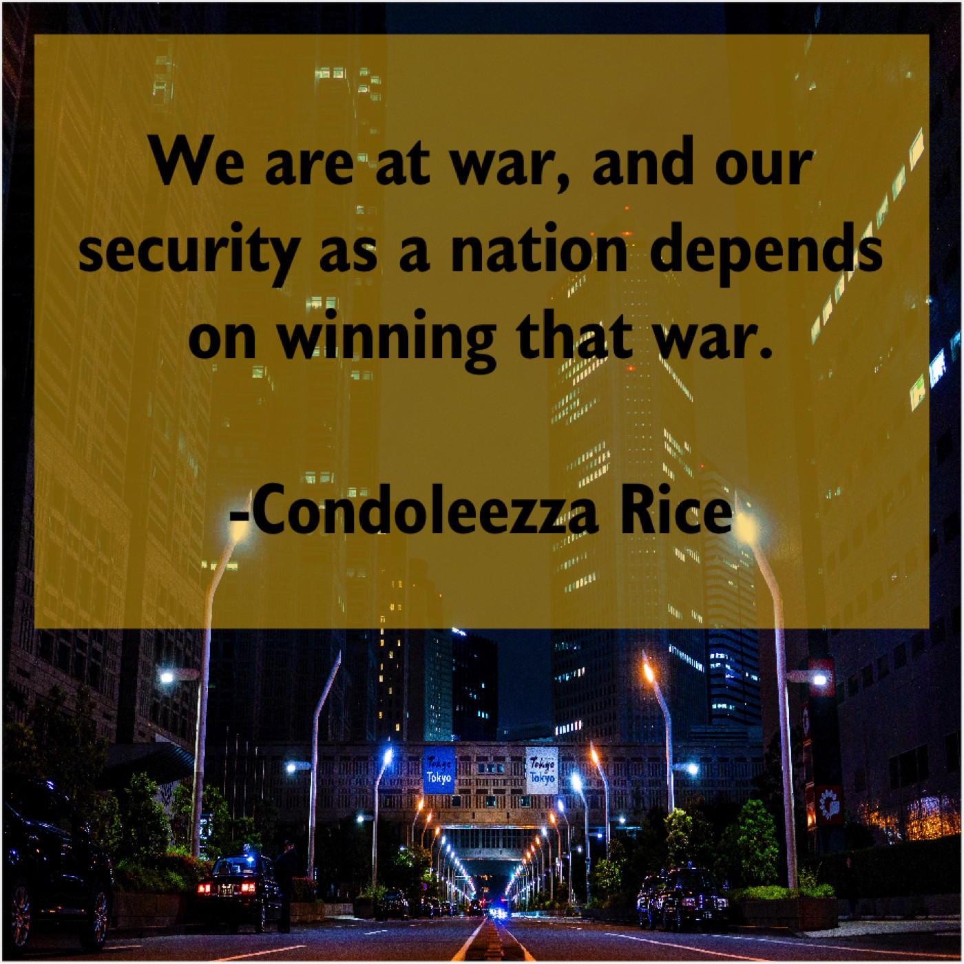 Condoleezza Rice Condoleezza Rice – We are at war, and… January 21, 2019 admin “We are at war, and our security as a nation depends on winning that war.”-Condoleezza Rice