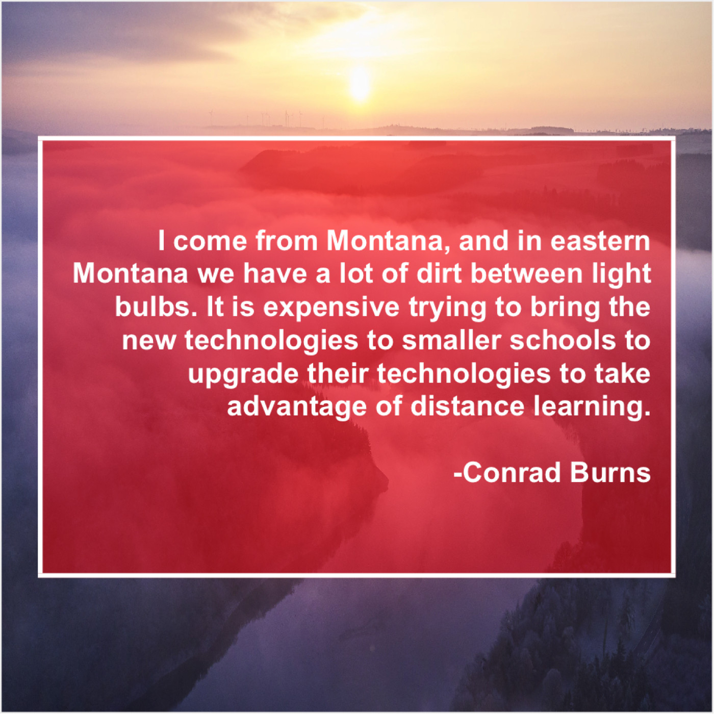 Conrad Burns Conrad Burns – I come from Montana, and… July 30, 2019 admin “I come from Montana, and in eastern Montana we have a lot of dirt between light bulbs. It is expensive trying to bring the new technologies to smaller schools to upgrade their technologies to take advantage of distance learning.”-Conrad Burns