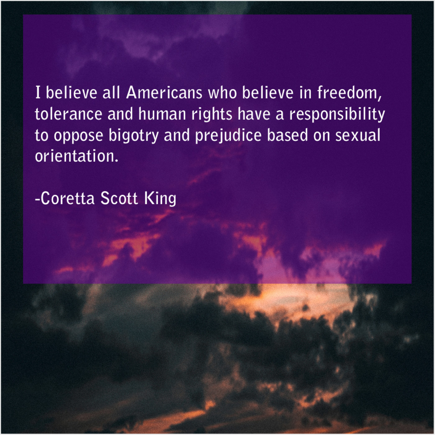 Coretta Scott King Coretta Scott King – I believe all Americans who… April 7, 2019 admin “I believe all Americans who believe in freedom, tolerance and human rights have a responsibility to oppose bigotry and prejudice based on sexual orientation.”-Coretta Scott King