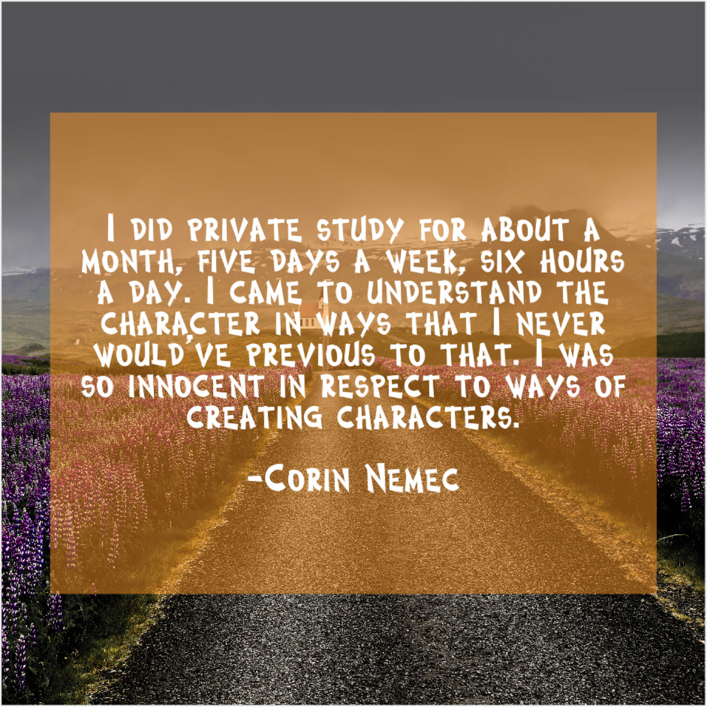 Corin Nemec Corin Nemec – I did private study for… March 8, 2019 admin “I did private study for about a month, five days a week, six hours a day. I came to understand the character in ways that I never would’ve previous to that. I was so innocent in respect to ways of creating characters.”-Corin Nemec