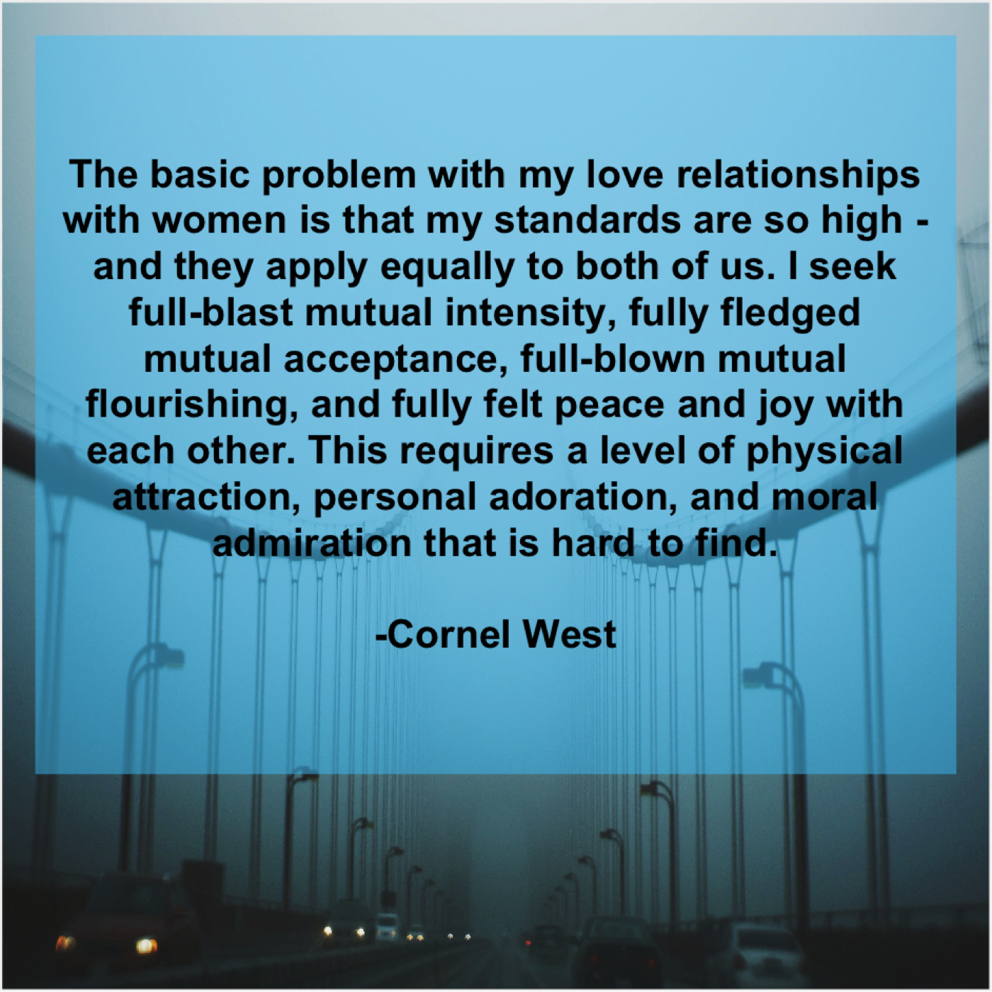 “The basic problem with my love relationships with women is that my standards are so high – and they apply equally to both of us. I seek full-blast mutual intensity, fully fledged mutual acceptance, full-blown mutual flourishing, and fully felt peace and joy with each other. This requires a level of physical attraction, personal adoration, and moral admiration that is hard to find.”