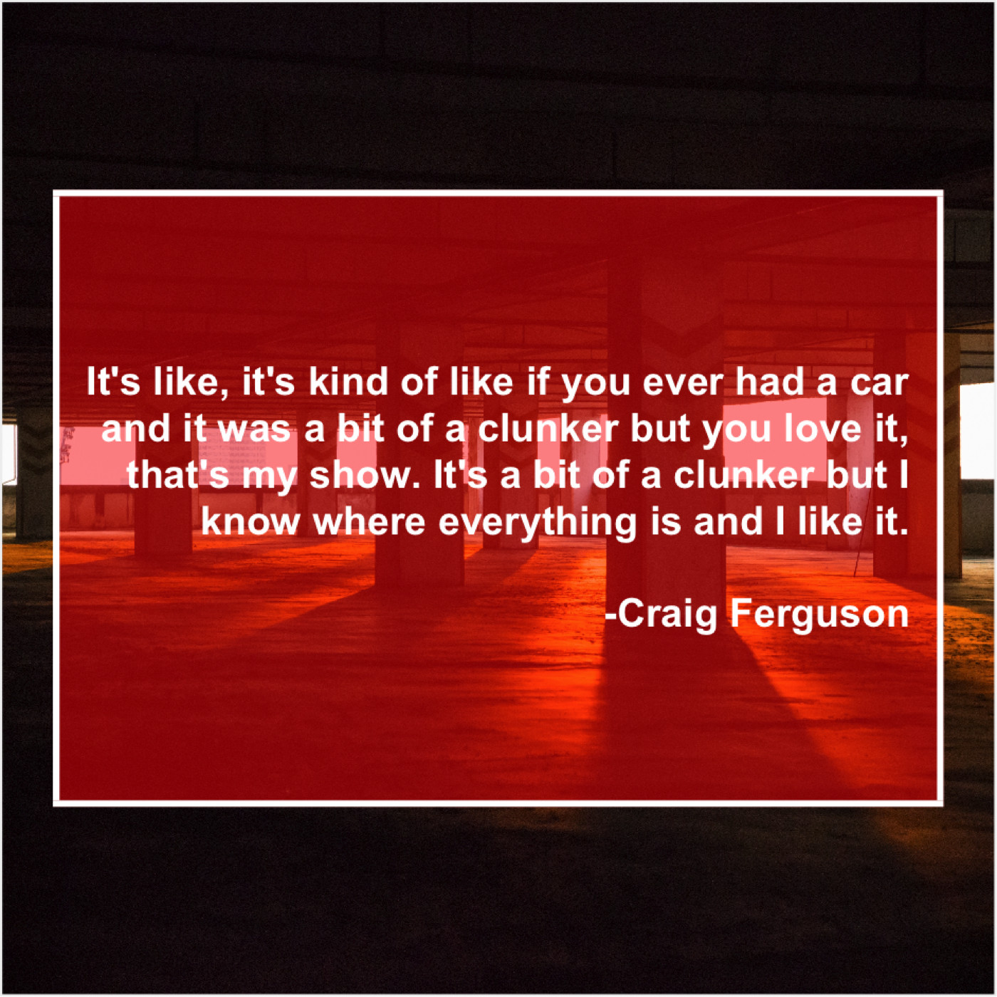 Craig Ferguson Craig Ferguson – It’s like, it’s kind of… May 17, 2019 admin “It’s like, it’s kind of like if you ever had a car and it was a bit of a clunker but you love it, that’s my show. It’s a bit of a clunker but I know where everything is and I like it.”-Craig Ferguson