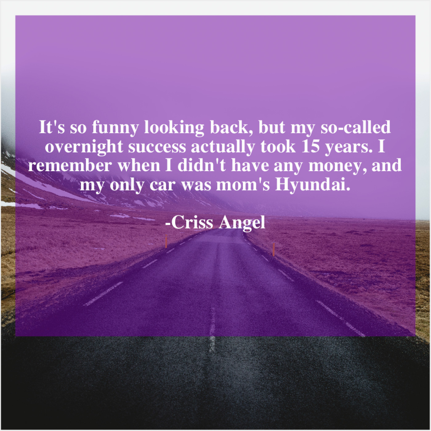 Criss Angel Criss Angel – It’s so funny looking back… June 2, 2019 admin “It’s so funny looking back, but my so-called overnight success actually took 15 years. I remember when I didn’t have any money, and my only car was mom’s Hyundai.”-Criss Angel