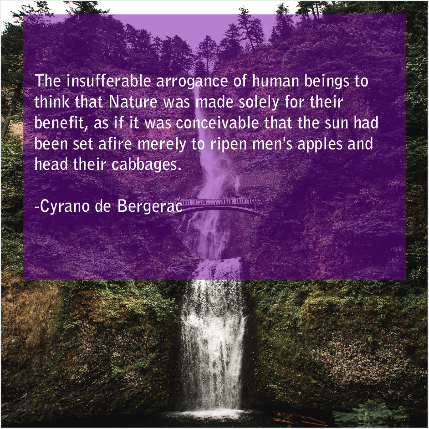 Cyrano de Bergerac Cyrano de Bergerac – The insufferable arrogance of human… June 19, 2019 admin “The insufferable arrogance of human beings to think that Nature was made solely for their benefit, as if it was conceivable that the sun had been set afire merely to ripen men’s apples and head their cabbages.”-Cyrano de Bergerac