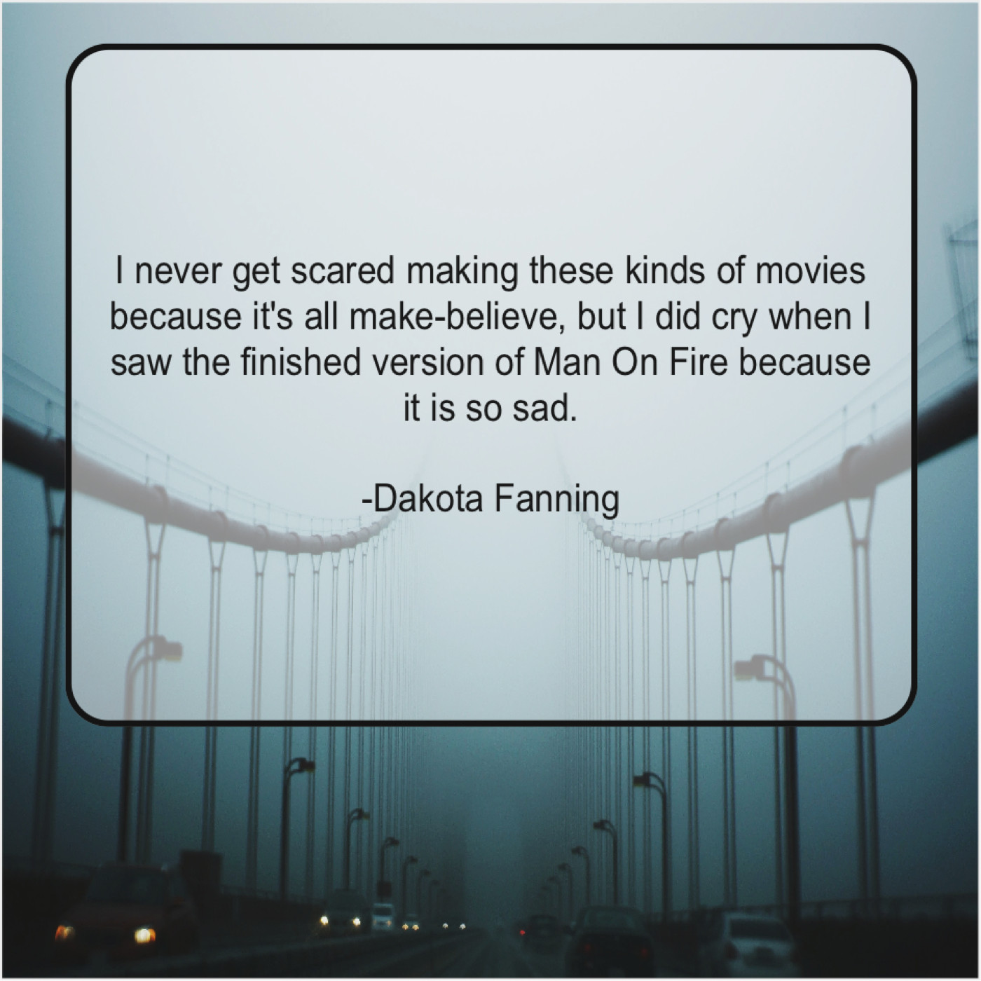 Dakota Fanning Dakota Fanning – I never get scared making… January 12, 2019 admin “I never get scared making these kinds of movies because it’s all make-believe, but I did cry when I saw the finished version of Man On Fire because it is so sad.”-Dakota Fanning