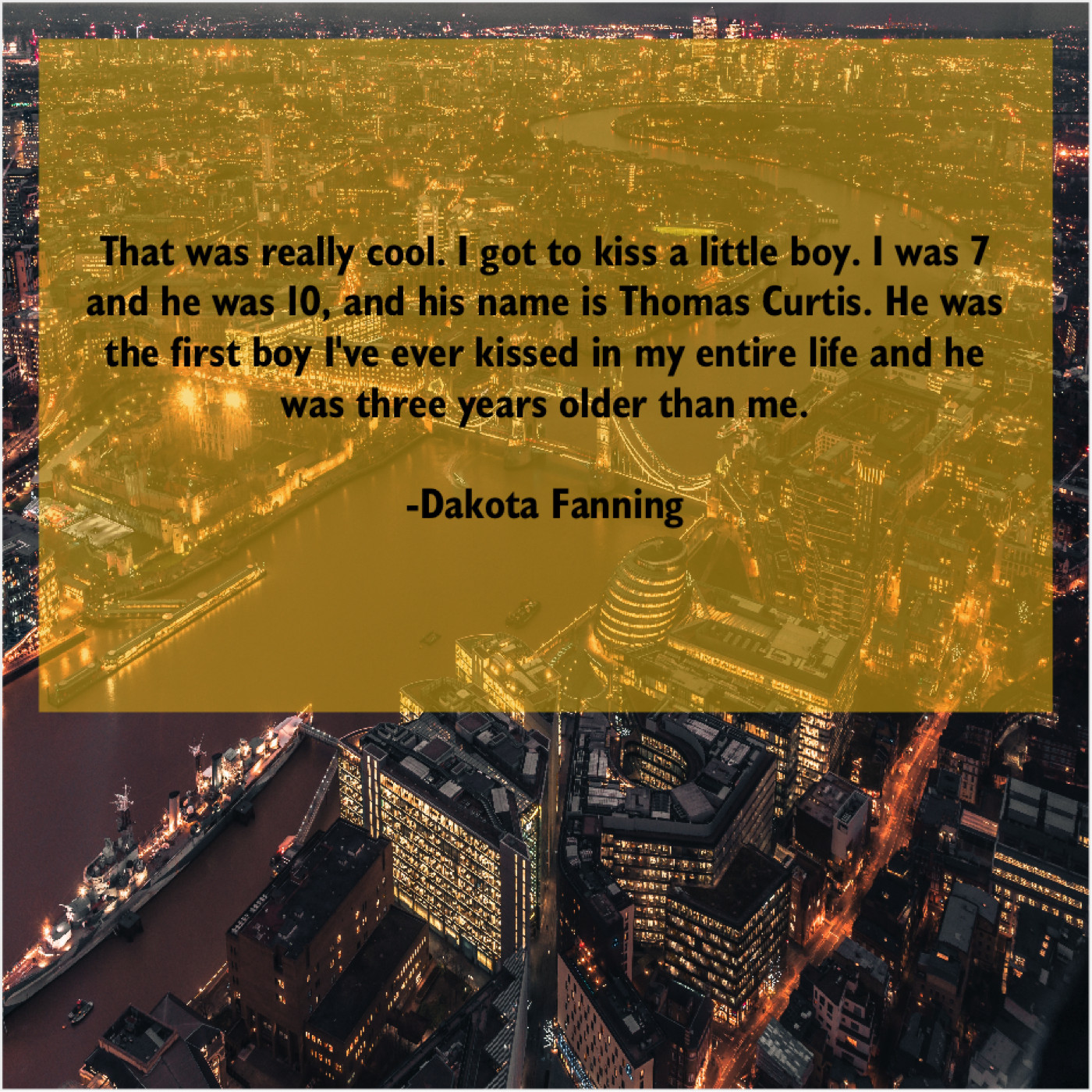 Dakota Fanning Dakota Fanning – That was really cool. I… January 11, 2019 admin “That was really cool. I got to kiss a little boy. I was 7 and he was 10, and his name is Thomas Curtis. He was the first boy I’ve ever kissed in my entire life and he was three years older than me.”-Dakota Fanning