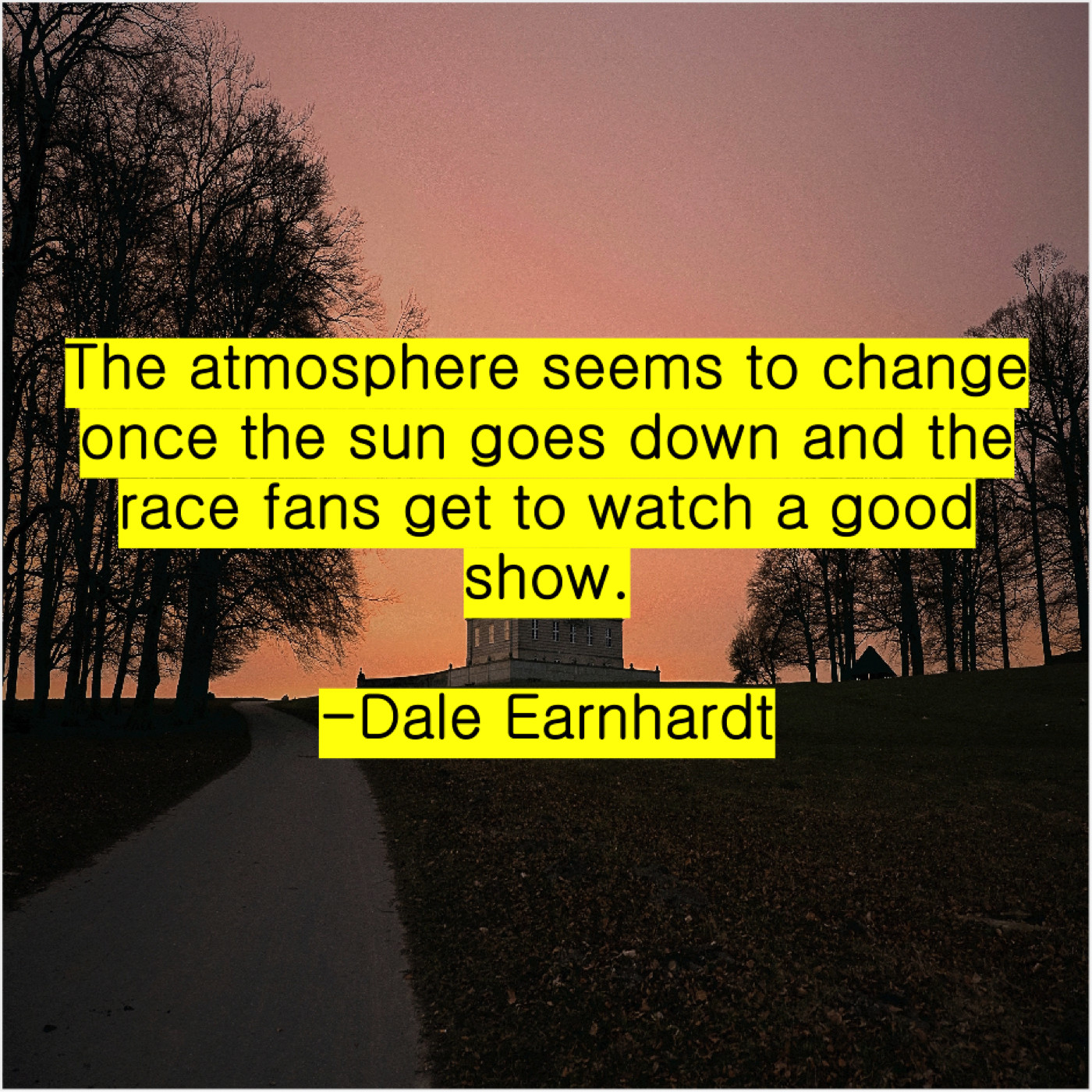 Dale Earnhardt Dale Earnhardt – The atmosphere seems to change… November 12, 2018 admin “The atmosphere seems to change once the sun goes down and the race fans get to watch a good show.”-Dale Earnhardt