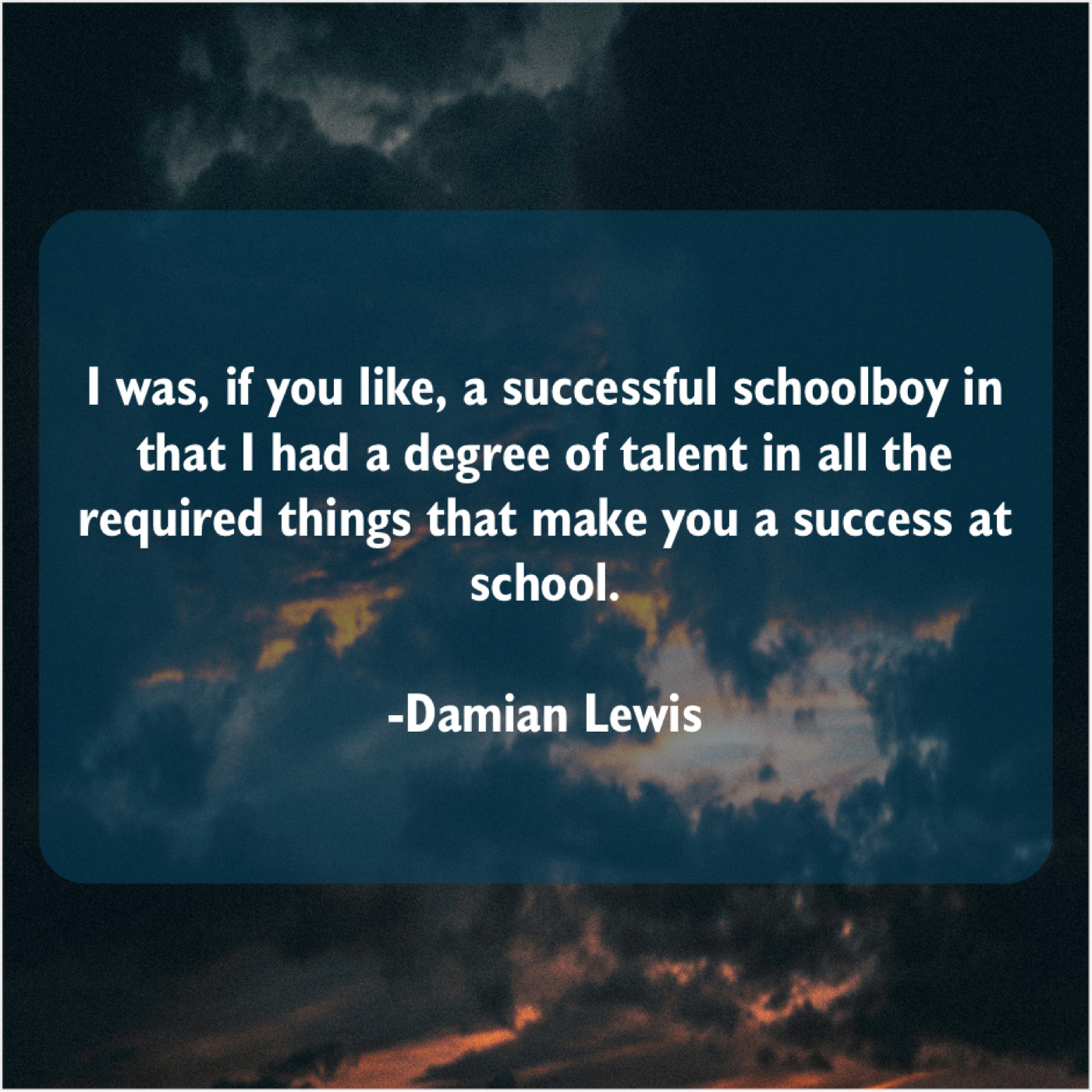 Damian Lewis Damian Lewis – I was, if you like… September 21, 2019 admin “I was, if you like, a successful schoolboy in that I had a degree of talent in all the required things that make you a success at school.”-Damian Lewis